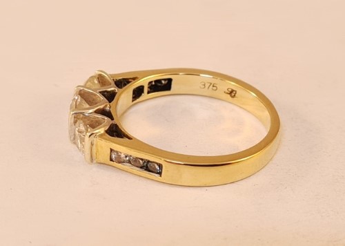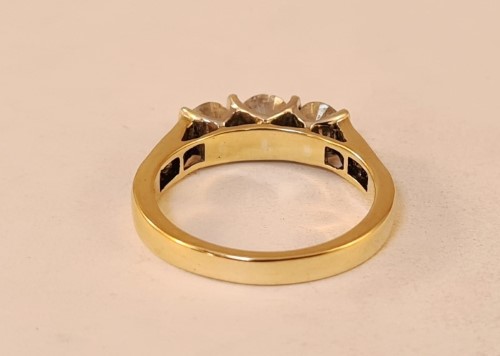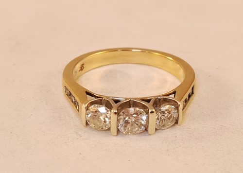 A striking trilogy of round brilliant cut diamonds of 0.38 carats each, flanked with three 0.015 carat round brilliant diamonds on either shoulder.
