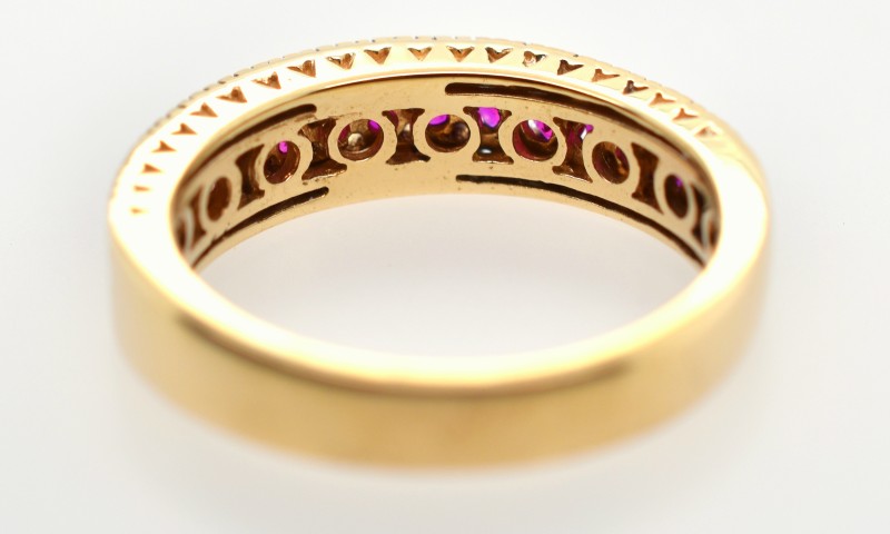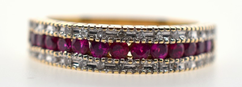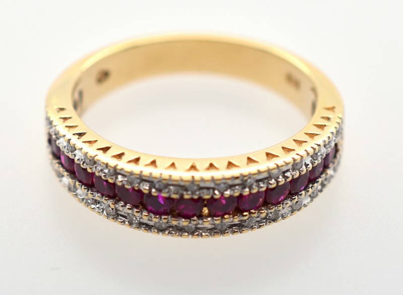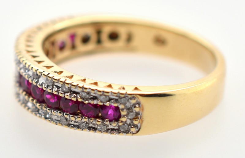 This stunning 9ct yellow gold ring features a vibrant row of pink stones framed by sparkling diamonds, creating a bold yet elegant design. Perfect for adding a pop of color and sophistication to any jewelry collection.