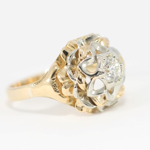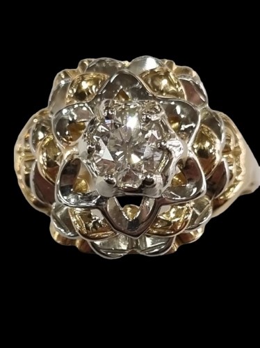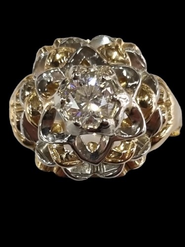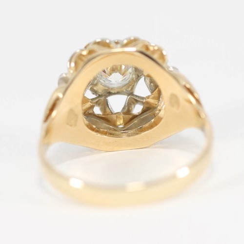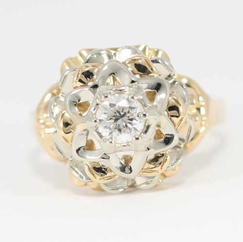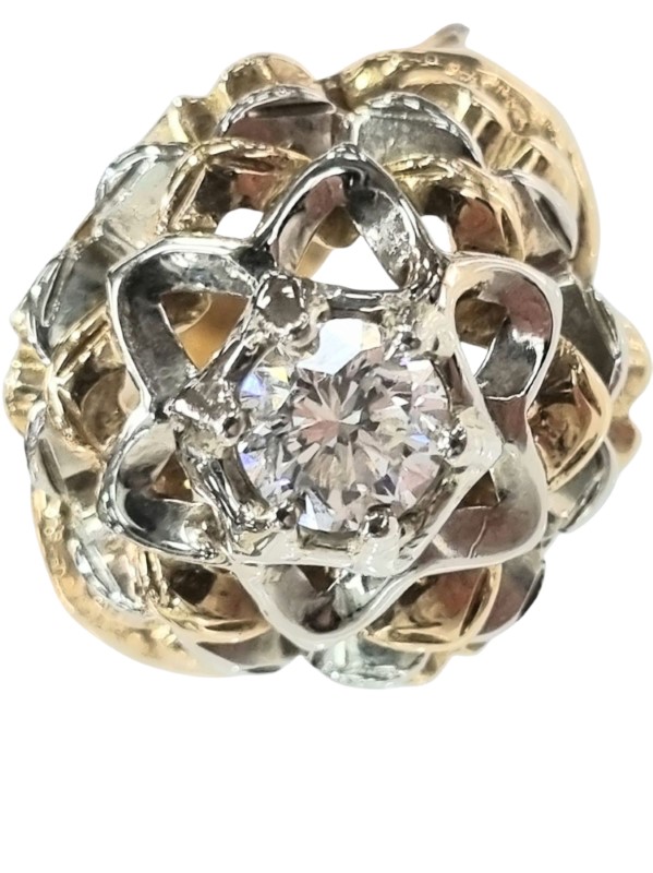 This exquisite 18 Karat two-tone gold antique dome cocktail ring features a captivating 0.51 carat F VS1 clarity diamond centre stone. The smooth ring band and claw setting showcase the hero stone beautifully. Weighing 5.64 grams, this timeless Ladies' diamond ring is a classic piece that will elevate any ensemble. All sizes and measurements are