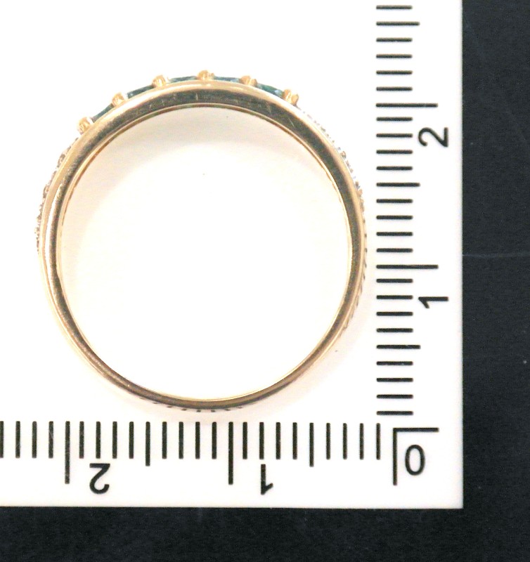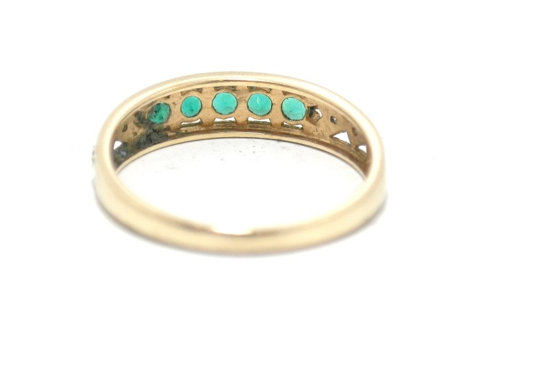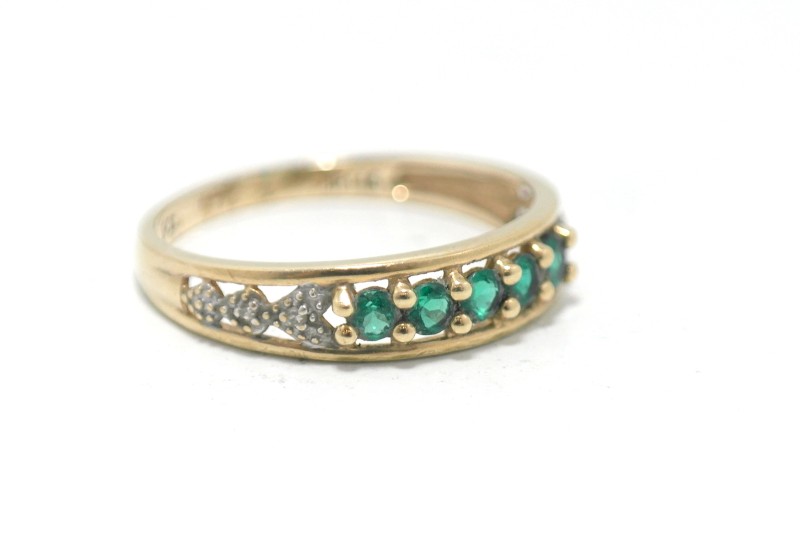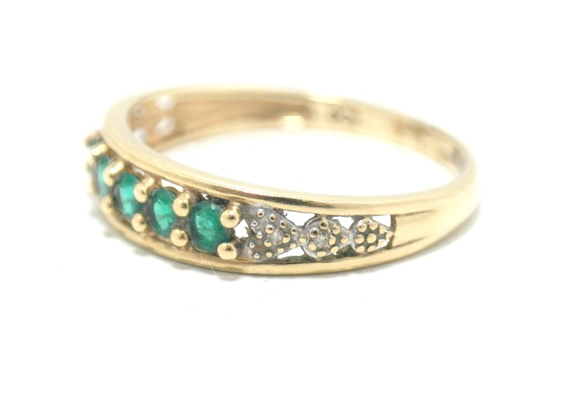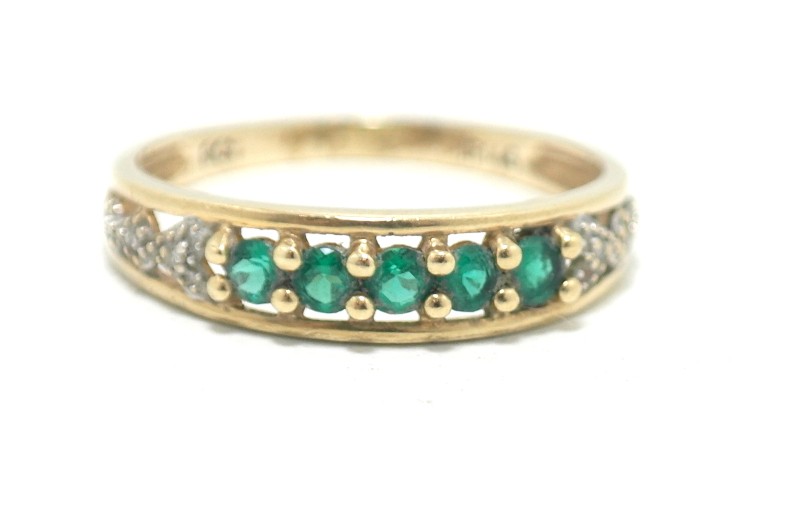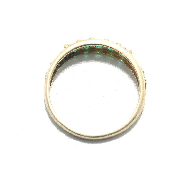 This chic 9ct yellow gold ring from Prouds features a straight row of 4 clear stones and 5 green stones. The smooth band has a ring size of O and weighs 1.55g. Engraved with the details "9CT JP146", this ladies' ring is a classic choice for everyday wear. All sizes and measurements are approximate.