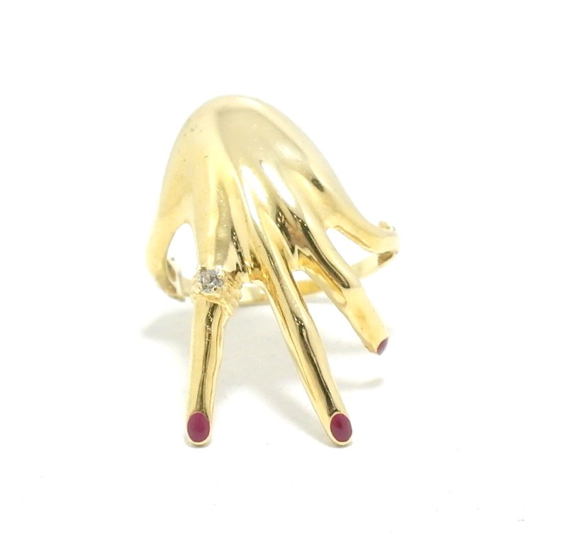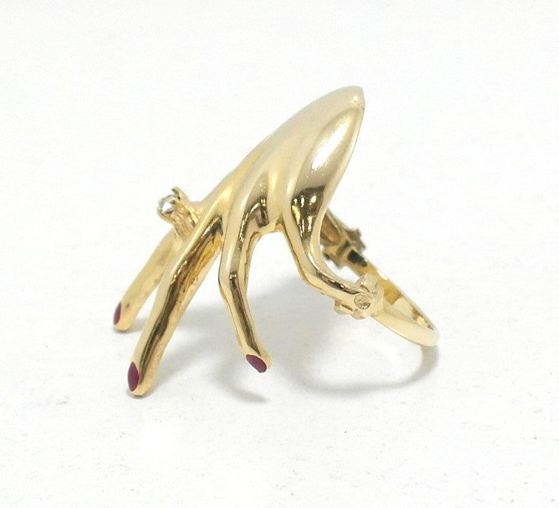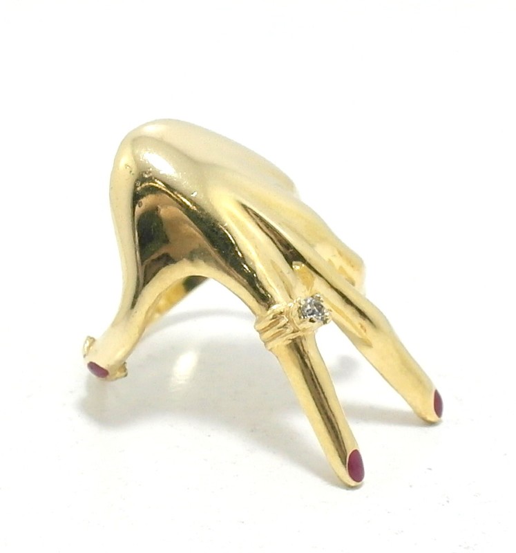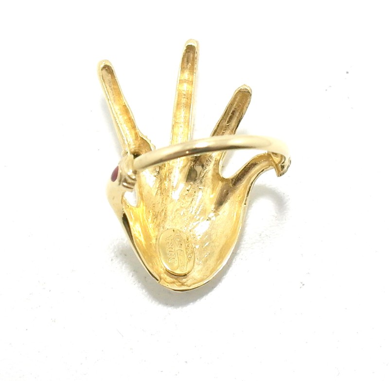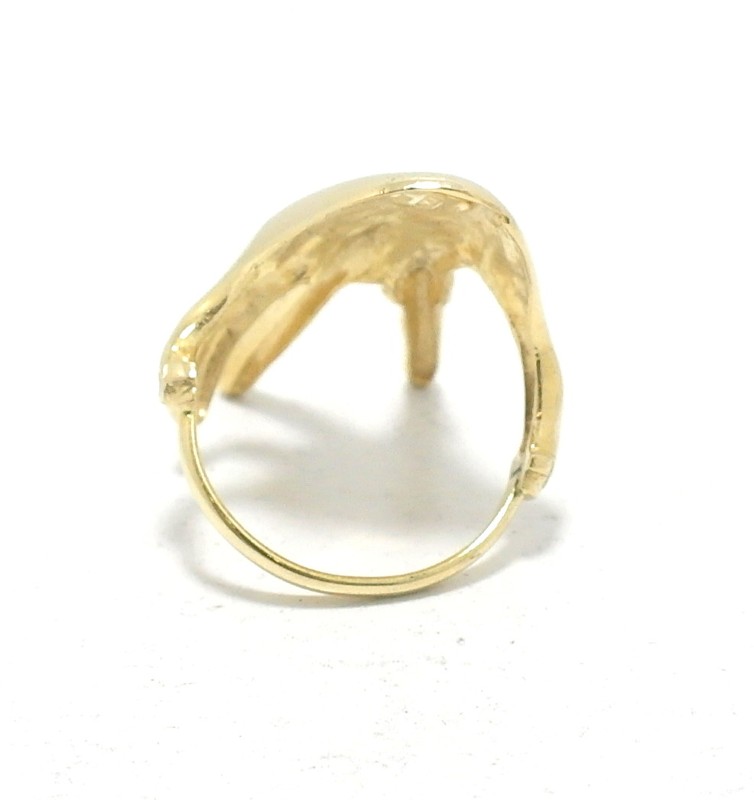 This stunning 18ct yellow gold ring features a classic solitaire design. The patterned ring band adds a beautiful textural element, complementing the vibrant yellow hue of the metal. With a total weight of 6.63g, this ring is a timeless piece that would make a wonderful addition to any jewellery collection. The hallmark of .750 confirms the quality of the gold used. Please note, one of the fingernails is missing. All sizes and measurements are approximate.