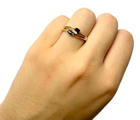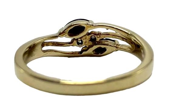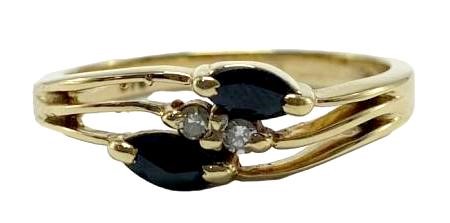 9ct yellow gold ring with two oval created sapphires and two small natural diamonds claw-set across the split shanks.