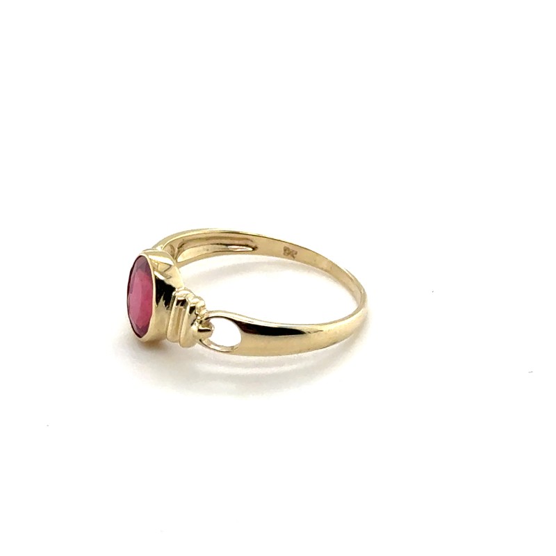 Yellow Gold Glass Filled Ruby bezel set with patterned shoulders