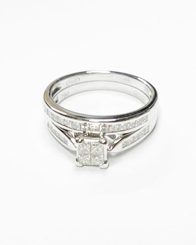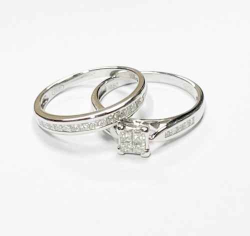 Princess cut diamonds invisible set with princess cut diamonds set in the shoulders and in the matching wedding ring