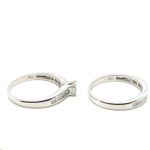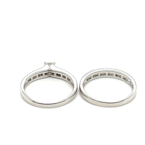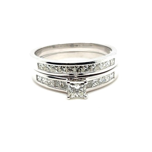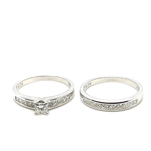 Make / Model: Princess Cut Diamond 4 Claw Set In The Raised Setting With Princess Cut Diamonds Channel Set In The Shoulders And In The Matching Wedding Ring