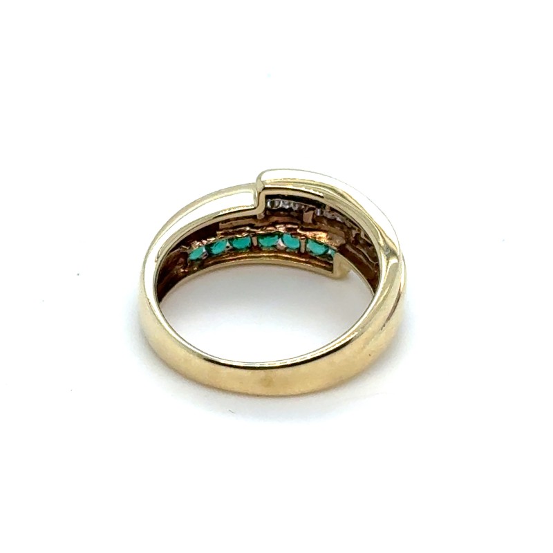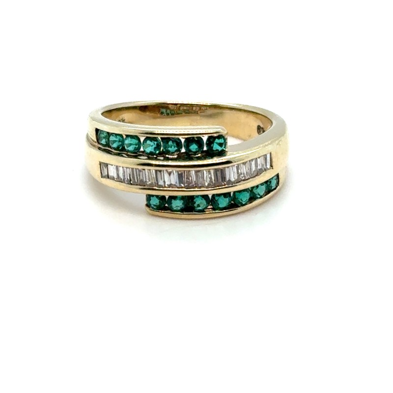 Synthetic Emeralds And Baguette Cut Diamonds Channel Set In The Cross-Over Ring
