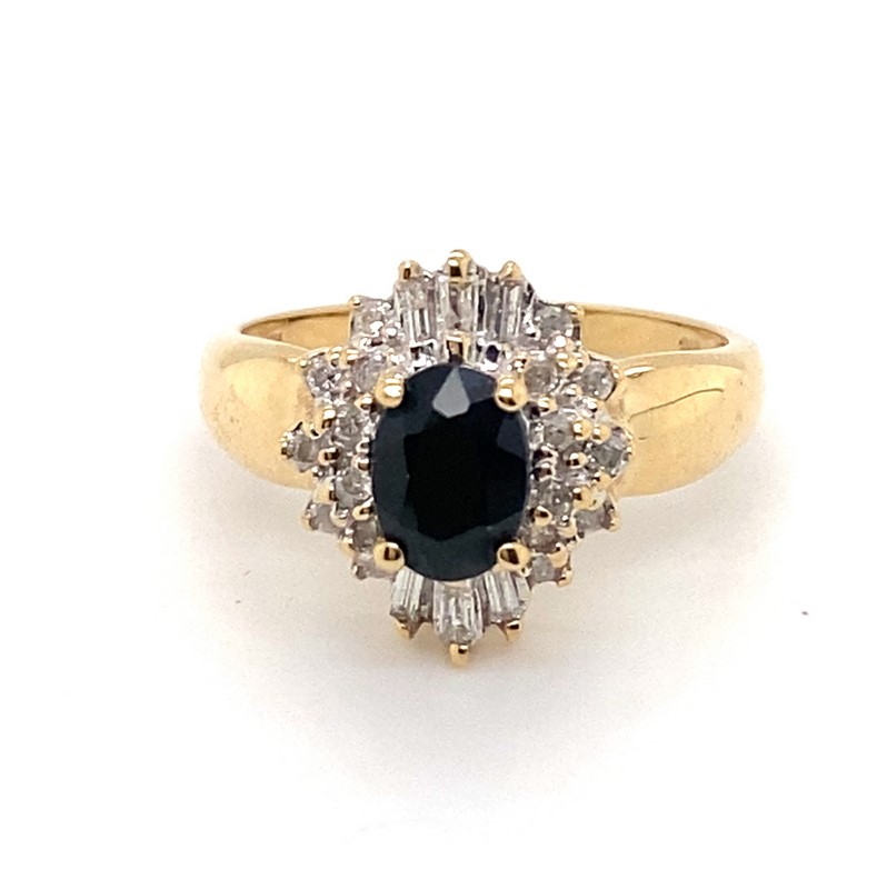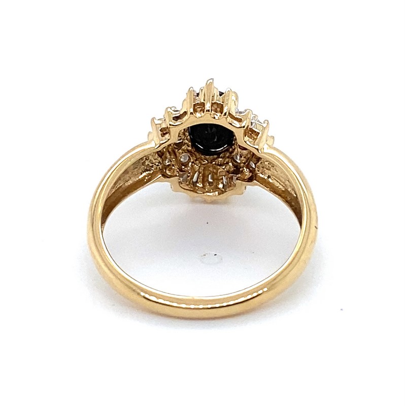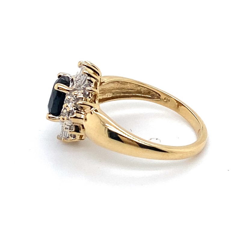 9CT YELLOW GOLD BLUE/BLACK SAPPHIRE SURROUNDED BY DIAMONDS DRESS RING
