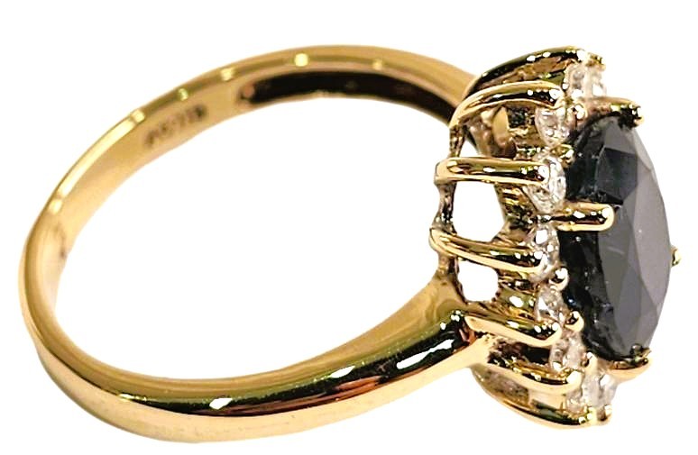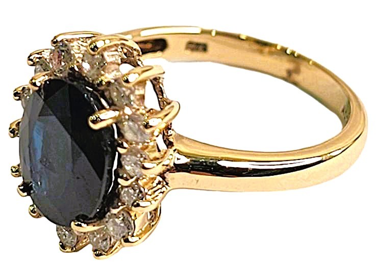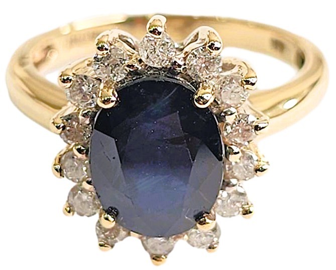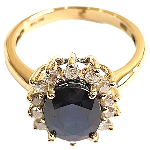 Oval Faceted Sapphire And Round Brilliant Cut Diamond Cluster 9ct Yellow Gold Ladies Diamond Ring Size L 0.35ct TDW Ring