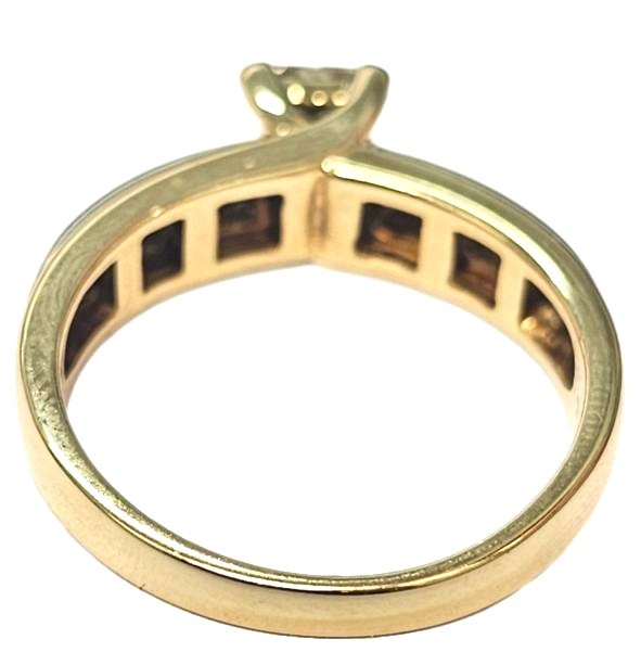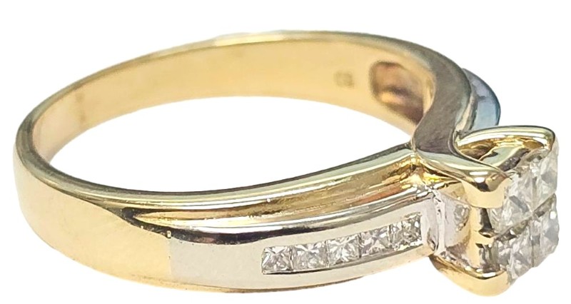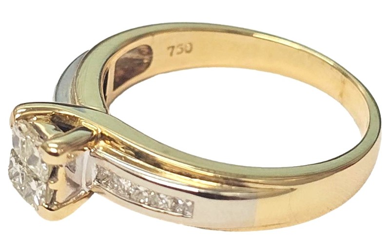 Crafted in 18 karat two-tone gold, this elegant ladies' ring features a captivating diamond centre stone. The hallmark of .750 ensures the quality of the precious metal. With a ring size of N½, this stunning piece will complement a variety of hand sizes. The total weight of 5.66 grams adds a substantial presence. All sizes and measurements are approximate.
