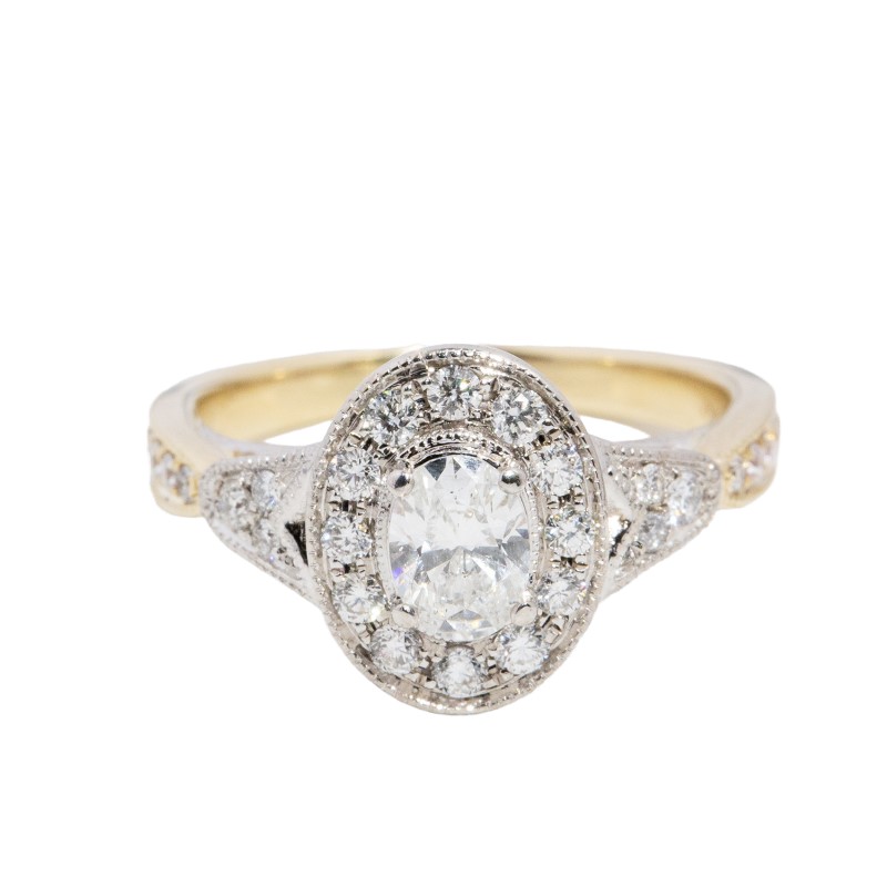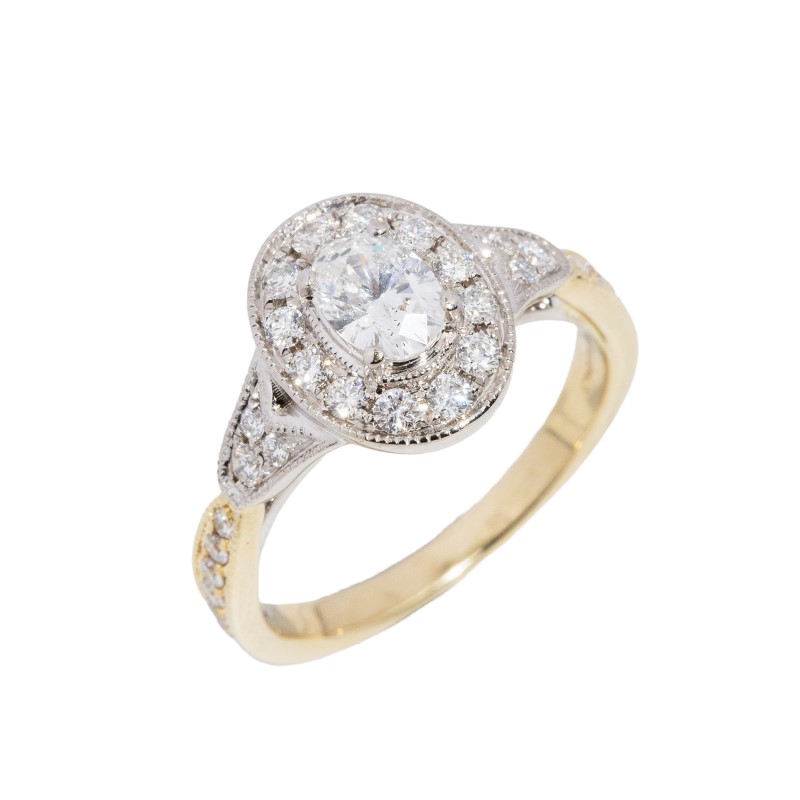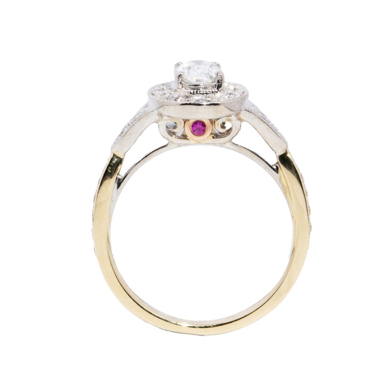 rounded tapered grain-set shank, a white gold top with grain-set tulip-like shoulders and a white gold halo