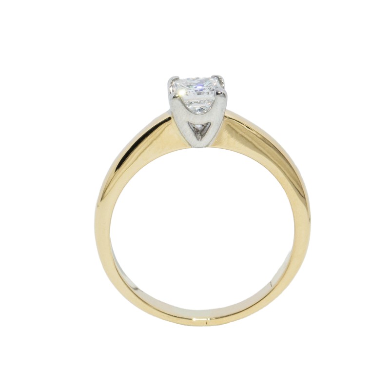 One cast polished 18K white & yellow gold diamond solitaire ring with a slightly rounded shank. The ring is a