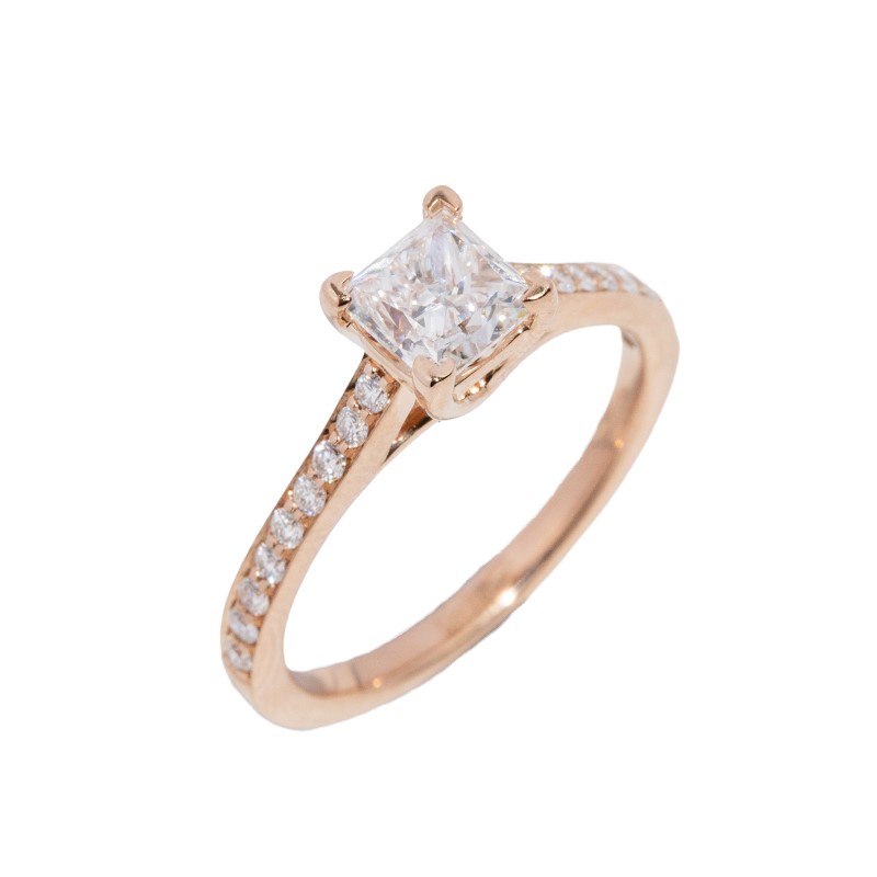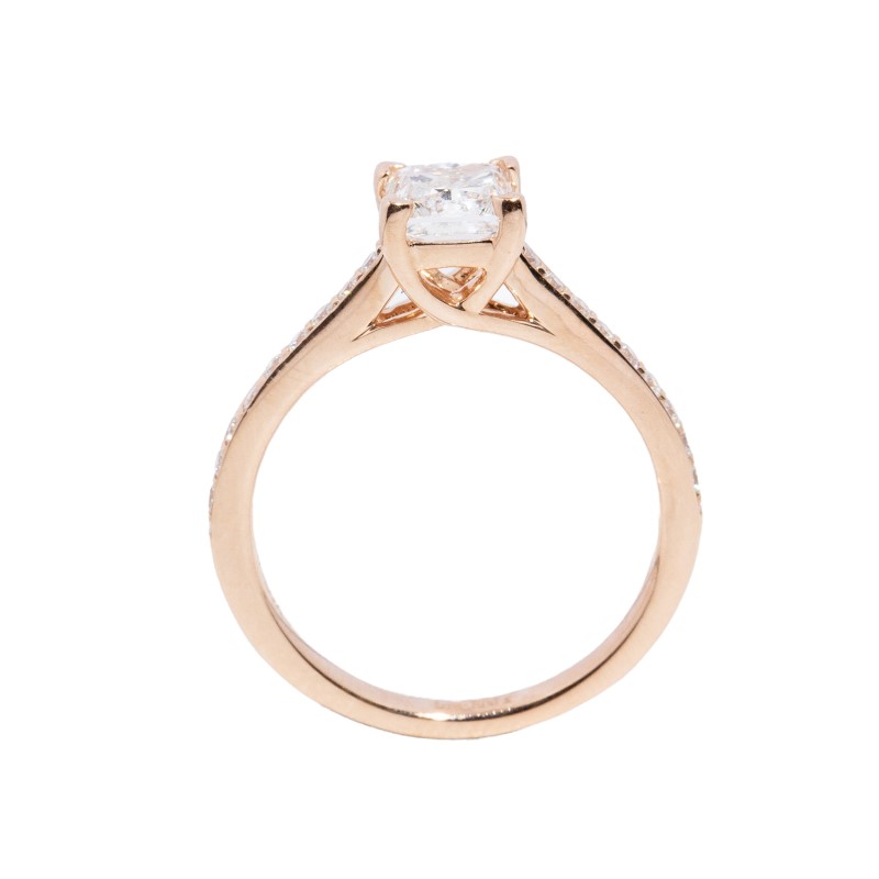 One cast polished 14K rose gold diamond ring with a slightly rounded shank and grain-set shoulders rising