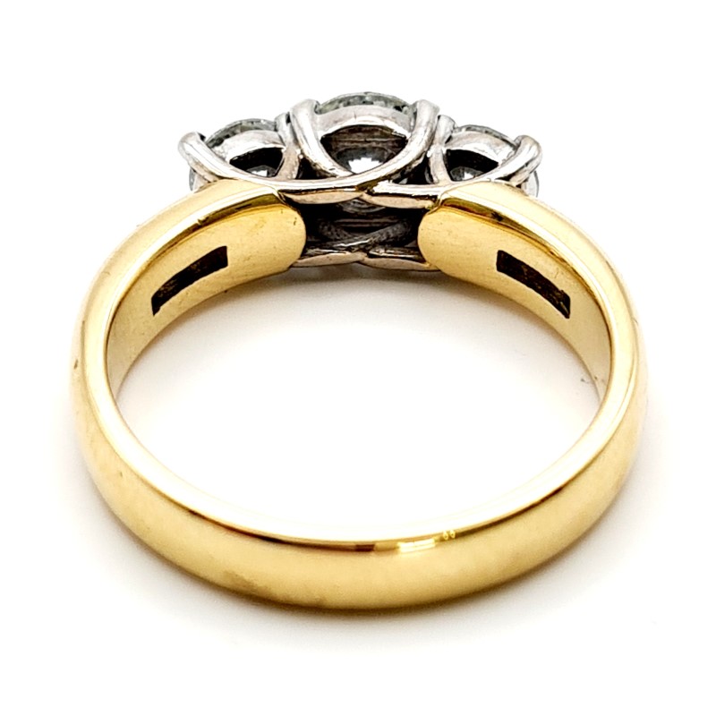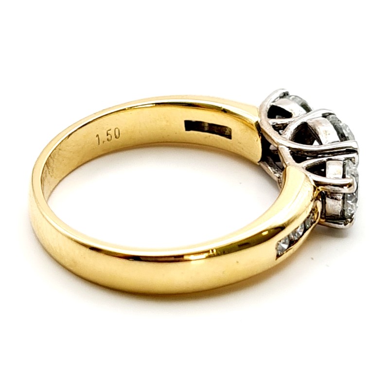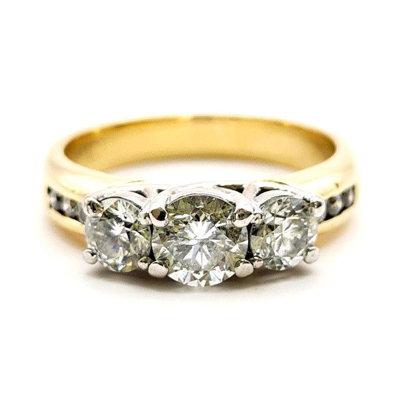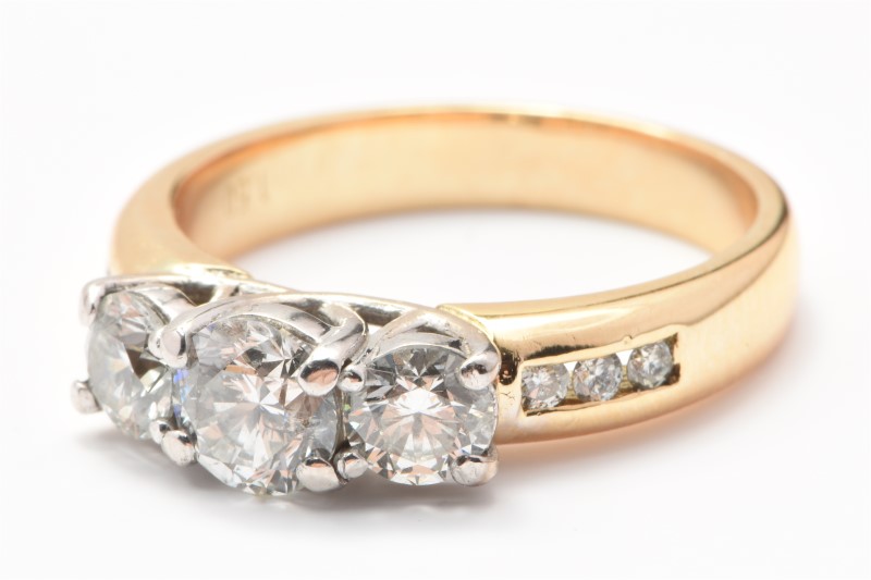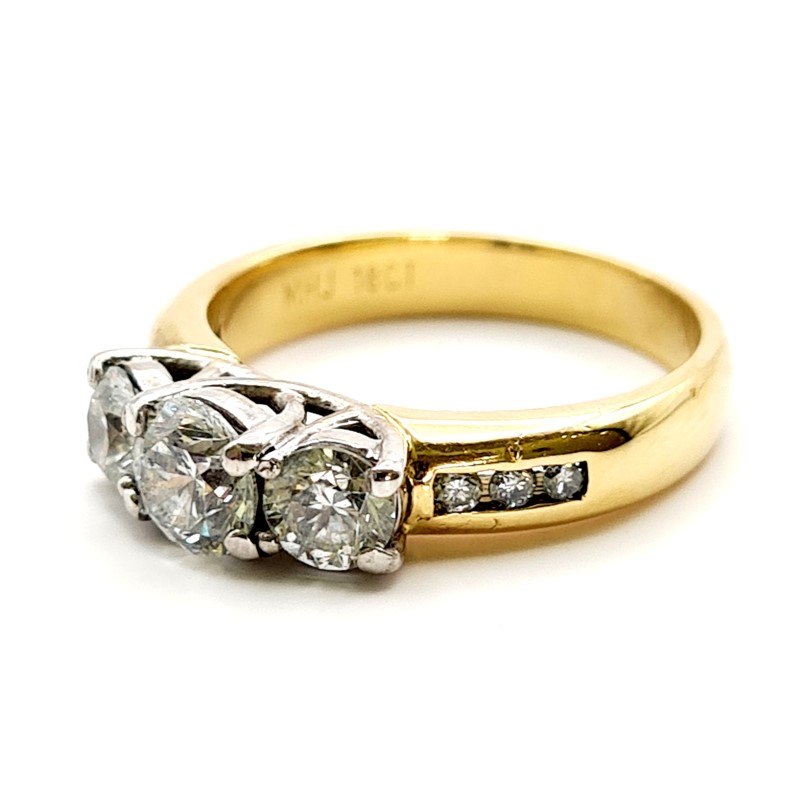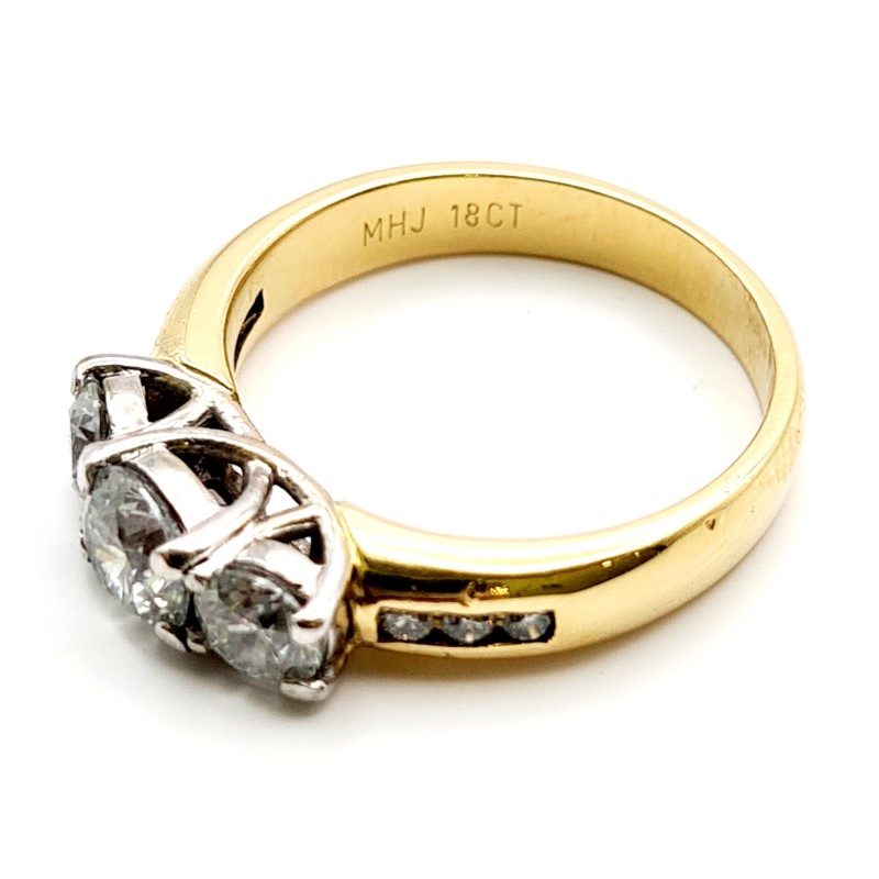 18CT YELLOW & WHITE GOLD 9 STONE DIAMOND RING . 3 ROUND BRILLIANT CUT DIAMONDS WHITE GOLD 4 CLAW SET WITH 3 ROUND BRILLIANT CUT DIAMONDS CHANNEL SET EACH SIDE IN A YELLOW GOLD 1/2 ROUND 3.38MM BAND.