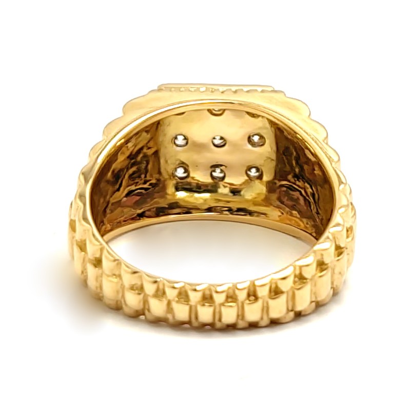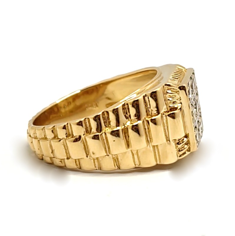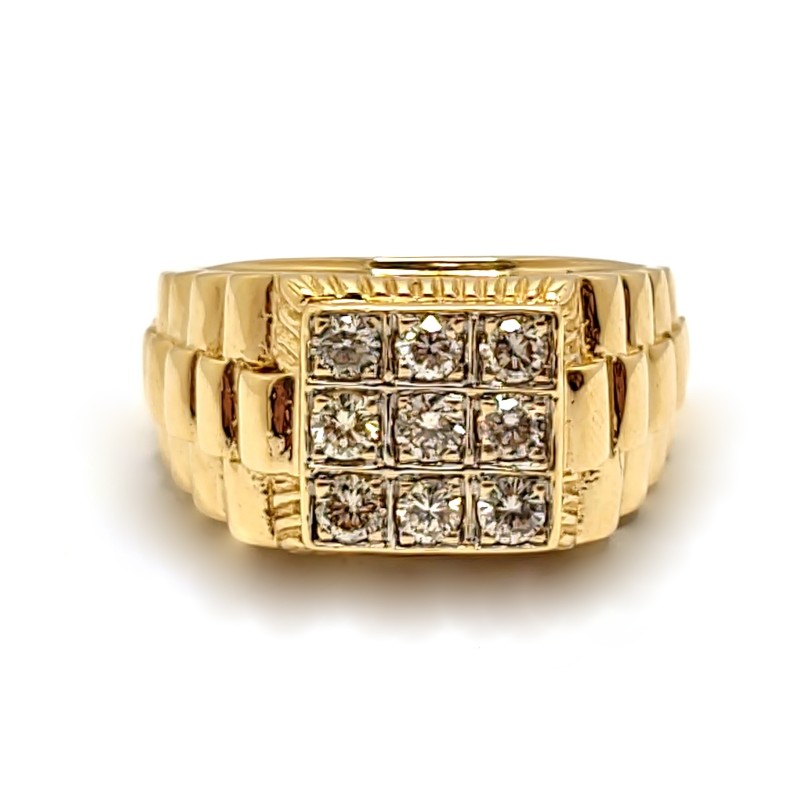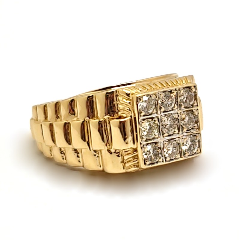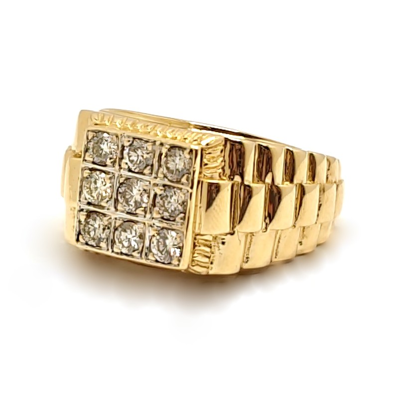 This 18 karat yellow gold ring features a round brilliant-cut diamond as the hero stone, complemented by nine additional diamonds. The total diamond weight is 0.08 carats, with the side stones graded I-K in colour and SI-P1 in clarity. Designed for men, this versatile diamond ring has a size T band.