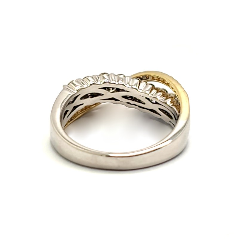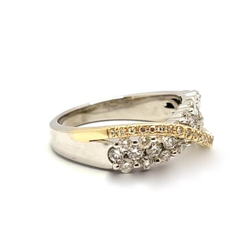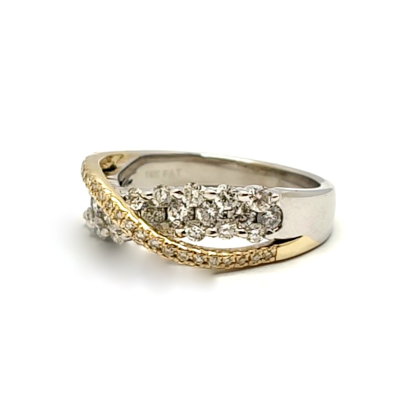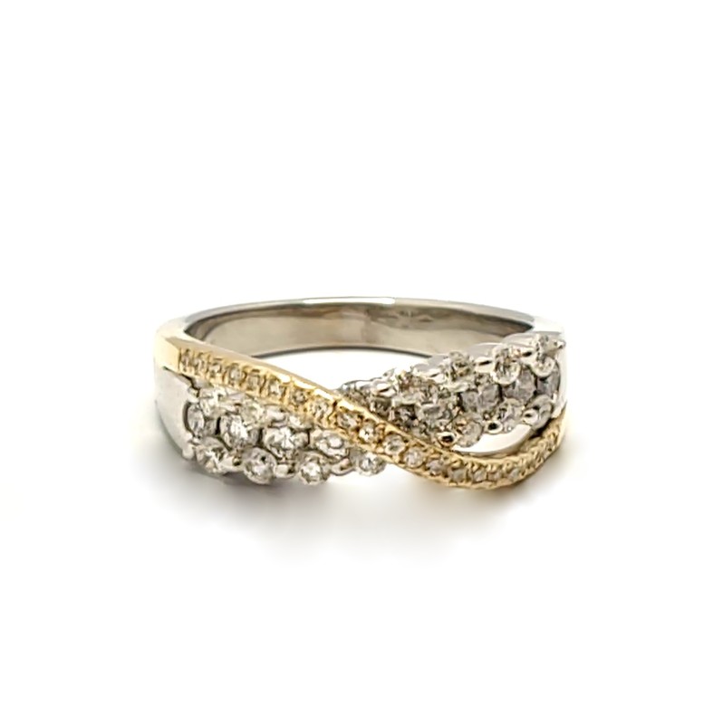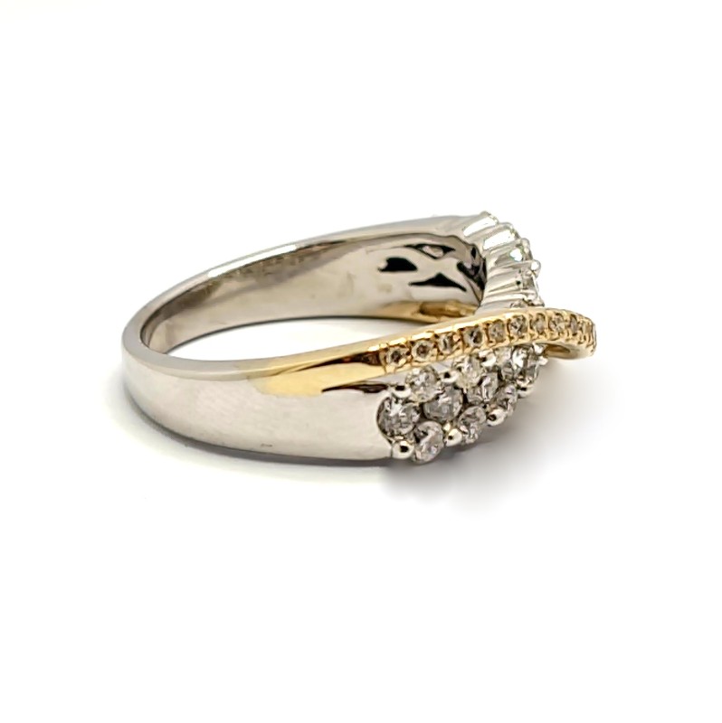 This elegant 14k yellow and white gold ring features a captivating array of diamonds. The hero stones are 10 round brilliant-cut diamonds in the I-K colour range and SI-P1 clarity, totaling 0.03 carats. An additional 16 diamonds of I-K colour and SI-P1 clarity, totaling 0.02 carats, and 20 diamonds of I-K colour and SI clarity, totaling 0.005 carats, complement the design. With a total weight of 4.7 grams and a size N ring size, this versatile piece is suitable for all genders.