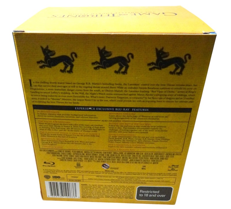 This stunning Blu-ray set contains the complete fourth season of the critically acclaimed HBO series Game of Thrones. Immerse yourself in the epic fantasy world of Westeros, filled with political intrigue, powerful dragons, and the ever-looming threat of the White Walkers. Experience the thrilling storylines and captivating performances that have made this show a global phenomenon.