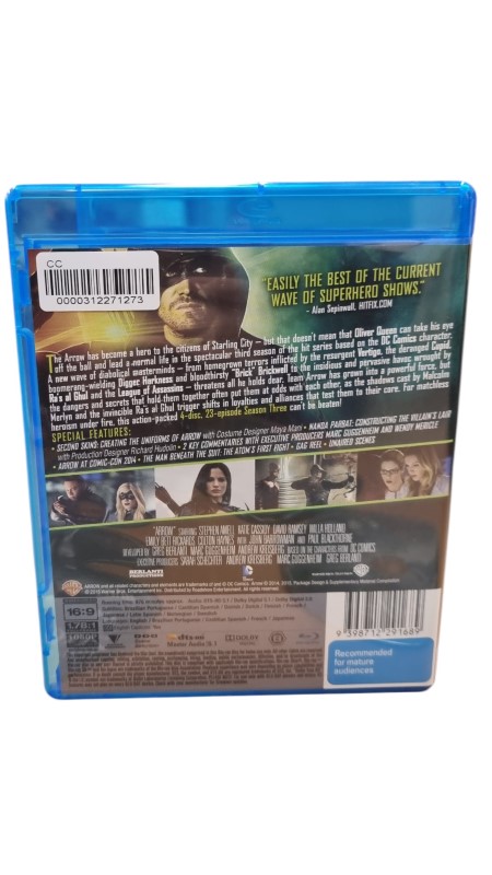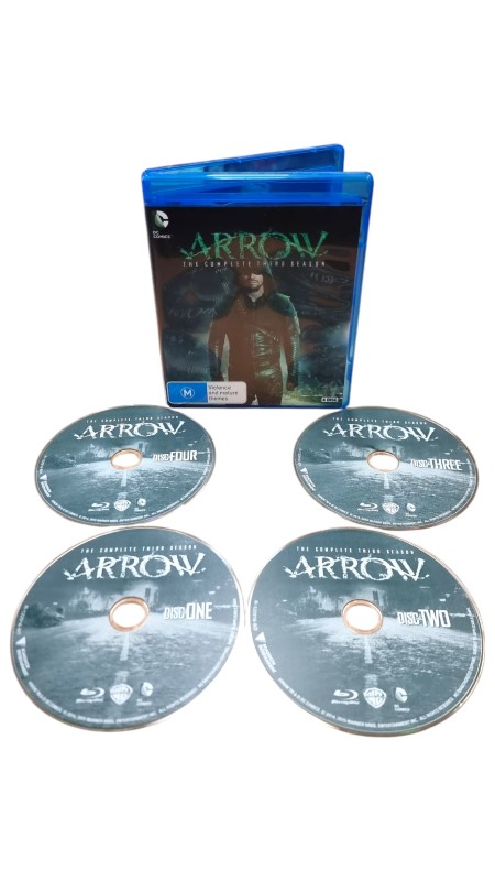 This Blu-ray disc contains the complete third season of the popular television series ARROW. Featuring thrilling action, compelling drama, and a talented cast, this set is a must-have for fans of the show. The disc may have a few light scratches, but it remains in good condition and ready for enjoyment.