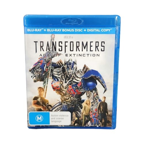 Experience the epic action of TRANSFORMERS: AGE OF EXTINCTION on Blu-ray. This thrilling movie follows Cade Yeager, a struggling inventor, as he discovers a Transformer and becomes caught up in an intergalactic conflict. With stunning visual effects and an intense storyline, this film delivers an exhilarating cinematic experience. Suitable for mature audiences.