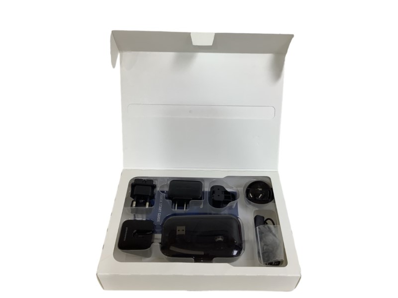 In box with charging case, adaptors, charger, and booklet