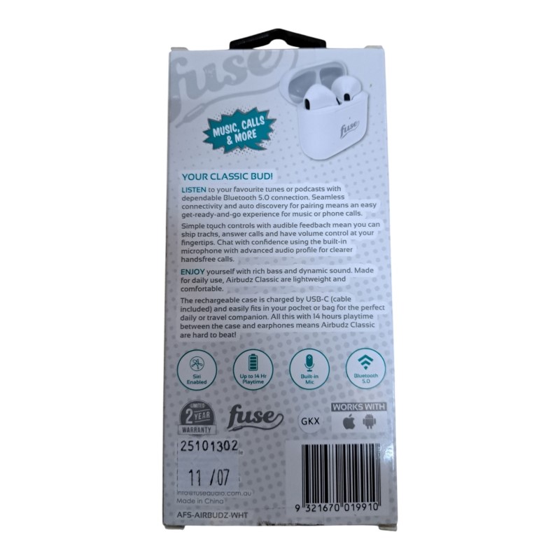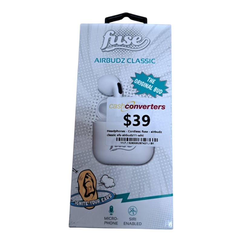 These sleek and modern cordless headphones from fuse offer a premium listening experience. The airbudz classic model (afs-airbudz11-wht) features advanced Bluetooth connectivity, providing seamless wireless freedom. With a stylish and comfortable design, these headphones are perfect for music, podcasts, or hands-free calls on the go.