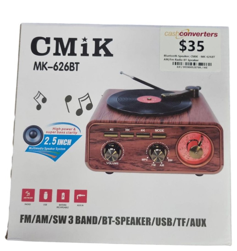 This versatile CMiK MK-626BT AM/FM radio Bluetooth speaker offers excellent sound quality and convenient wireless connectivity. With built-in radio functionality and Bluetooth pairing, you can enjoy your music, podcasts, and more from a variety of sources. Despite some light cosmetic wear, this speaker remains in good working condition and is ready to provide high-quality audio wherever you go.
