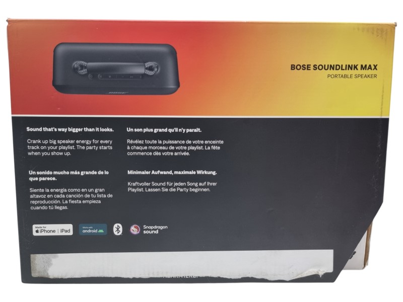 This Bose SoundLink Max Portable Speaker delivers exceptional sound quality in a compact, portable design. With its Bluetooth connectivity, you can wirelessly stream music from your compatible devices. The original box is included, ensuring a complete package. Despite some minor signs of wear, this speaker remains in good condition, ready to provide an immersive audio experience wherever you go.