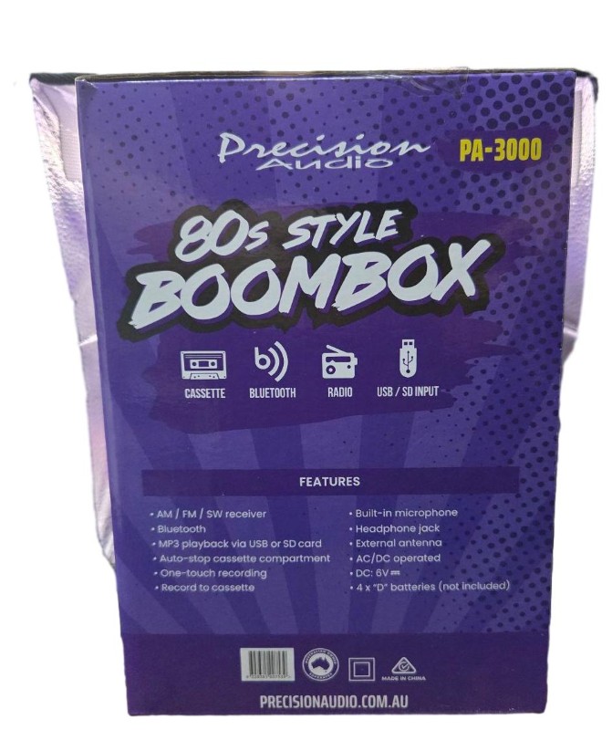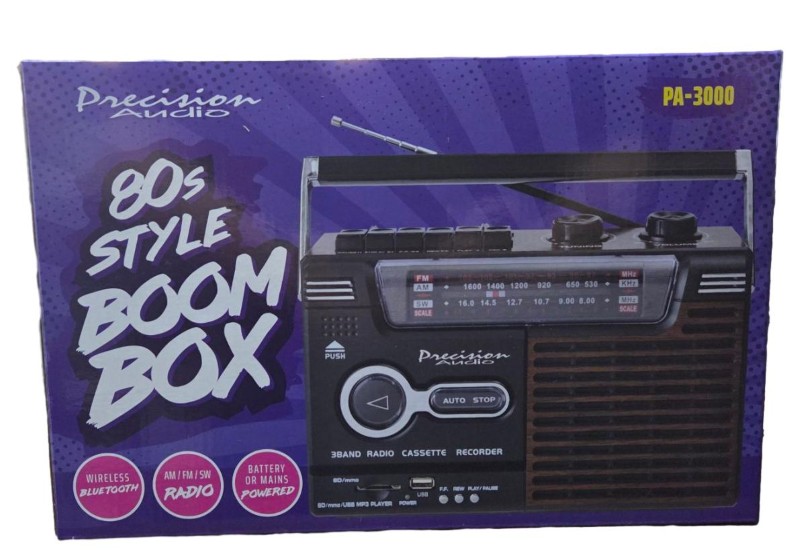 This retro-inspired 80s-style Precision Audio PA-3000 Bluetooth speaker offers a nostalgic listening experience with its iconic boombox design. Featuring a powerful sound and convenient wireless connectivity, it's perfect for adding a touch of vintage flair to any space.