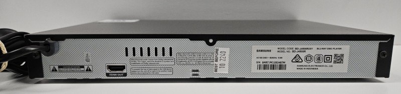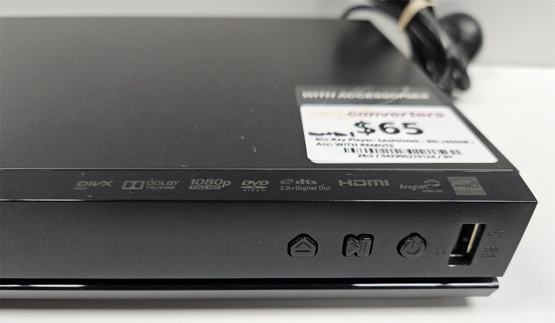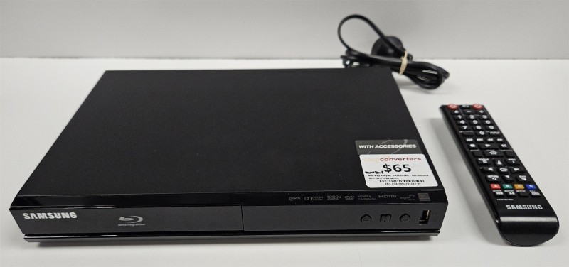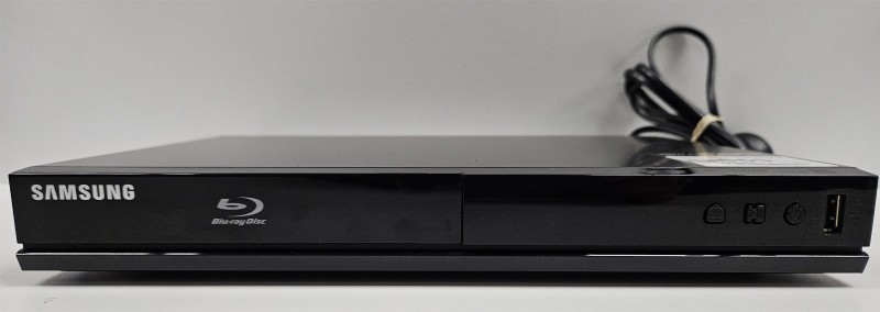 This Samsung BD-J4500R Blu-Ray player delivers crisp, high-definition entertainment for your home theatre setup. Designed for reliable performance, this media player reads Blu-Ray discs, DVDs, and CDs with excellent picture quality. The included remote control makes navigation effortless from your couch. With minimal signs of wear, this unit is ready to enhance your viewing experience.