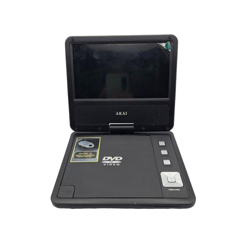 This compact Akai 7" portable DVD player is a versatile media device for enjoying your favourite movies and TV shows on the go. With a sleek and portable design, it's perfect for use at home or while travelling. The player features a range of functions and is in good condition, though the remote is missing its back cover.