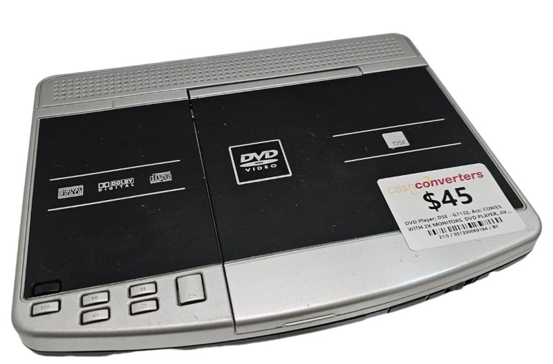 This DSE G7132 DVD player is a versatile home entertainment solution. Featuring a sleek design, it seamlessly integrates with your existing home theatre setup. With the included remote control, you can easily navigate and control your media playback. The DVD player comes bundled with 2 monitors, AV cords, a console controller, and a remote, as well as a car power cord and a protective bag for convenient portability.