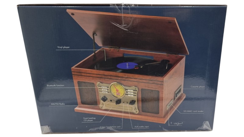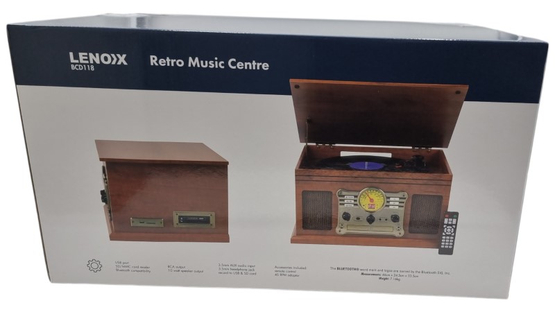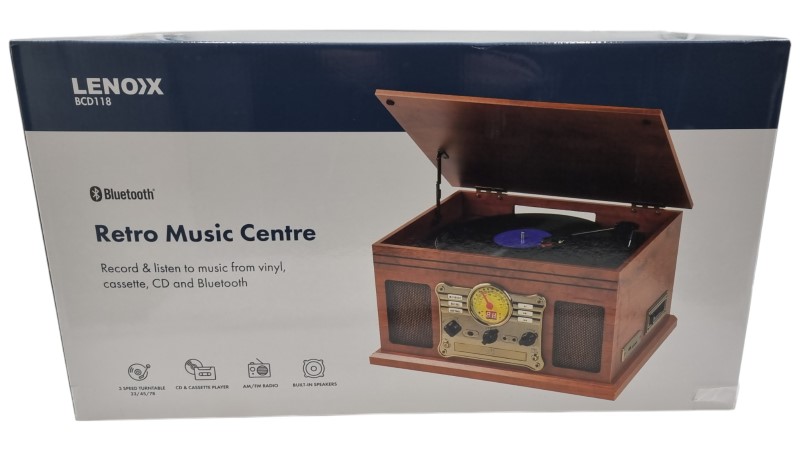 This vintage-inspired Lenoxx BCD118 Bluetooth Retro Music Centre offers a delightful blend of classic style and modern functionality. Equipped with Bluetooth connectivity, you can seamlessly stream your favourite tunes from your mobile devices. The included remote control provides convenient command over the music experience. With its sleek and compact design, this record player will be a stylish addition to any home entertainment setup.