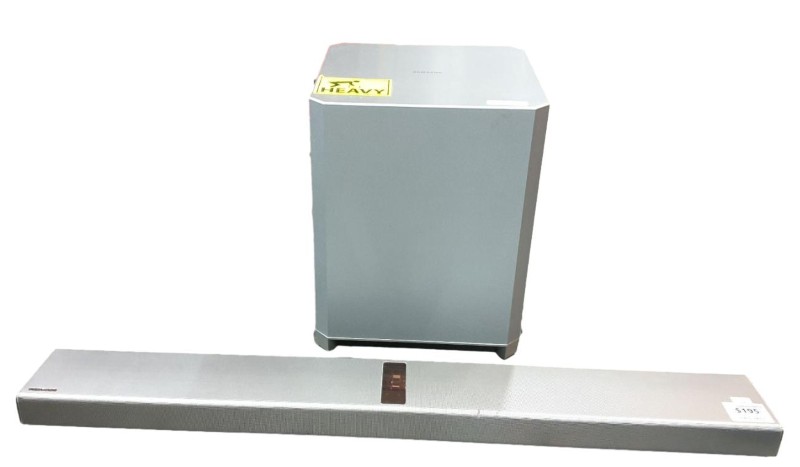 This Samsung HW-H751 sound bar with subwoofer delivers immersive home theatre audio. With its powerful speakers and subwoofer, it provides a cinematic sound experience to elevate your TV viewing. The compact design allows for easy placement in any living space. Despite some visible signs of wear, this unit remains fully functional and ready to enhance your entertainment setup.