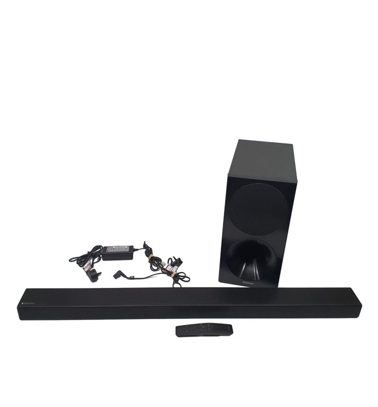 This Samsung HW-M550 2.1ch Soundbar and Sub is a versatile home theatre solution that delivers immersive audio. With a sleek and compact design, it seamlessly integrates with your TV setup. The system features a 2.1 channel configuration, providing a rich, powerful sound experience. Its wireless subwoofer adds deep, rumbling bass to your movies, music, and gaming sessions.