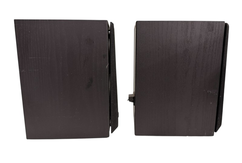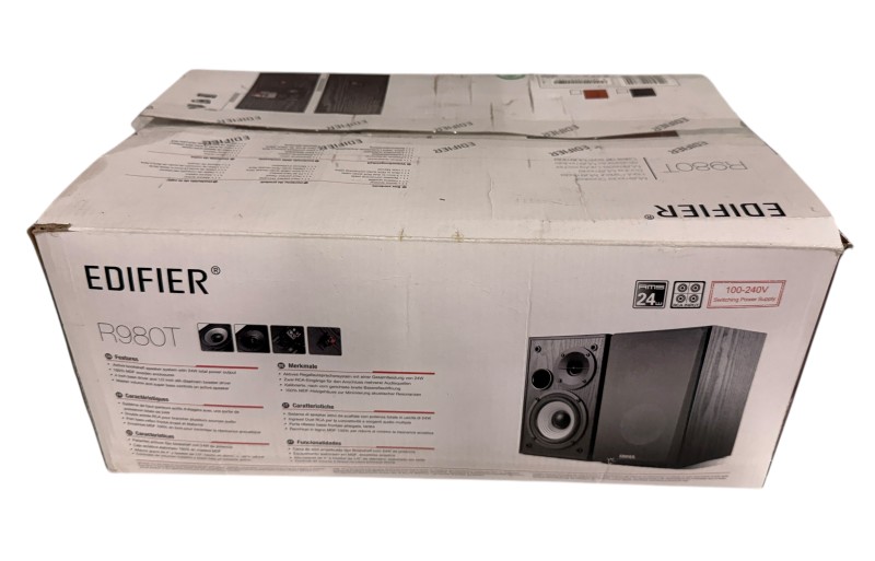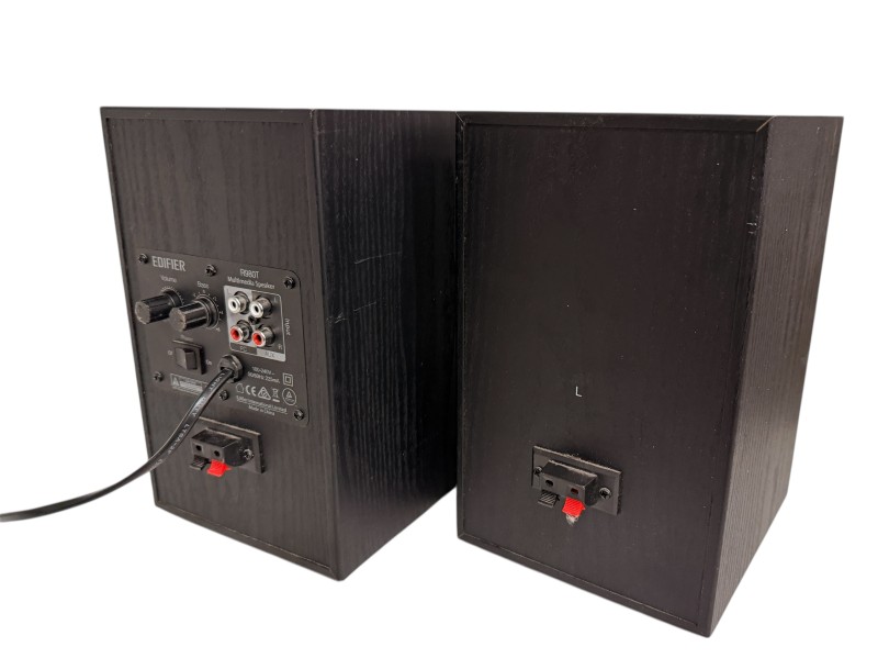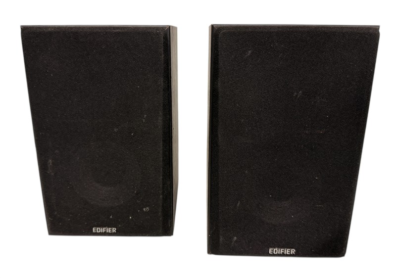 These Edifier R980T bookshelf speakers deliver impressive audio performance for your home entertainment setup. With a sleek, compact design, they can easily fit on bookshelves or side tables. The speakers feature a full-range driver and bass port for rich, balanced sound. They connect directly to your TV, stereo, or other audio source via the included cables, providing a convenient wired setup. These speakers are in good condition, with some light marks visible across the front panels.