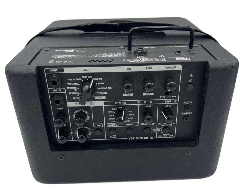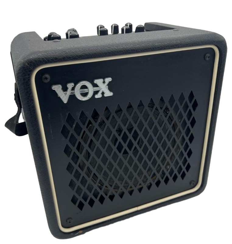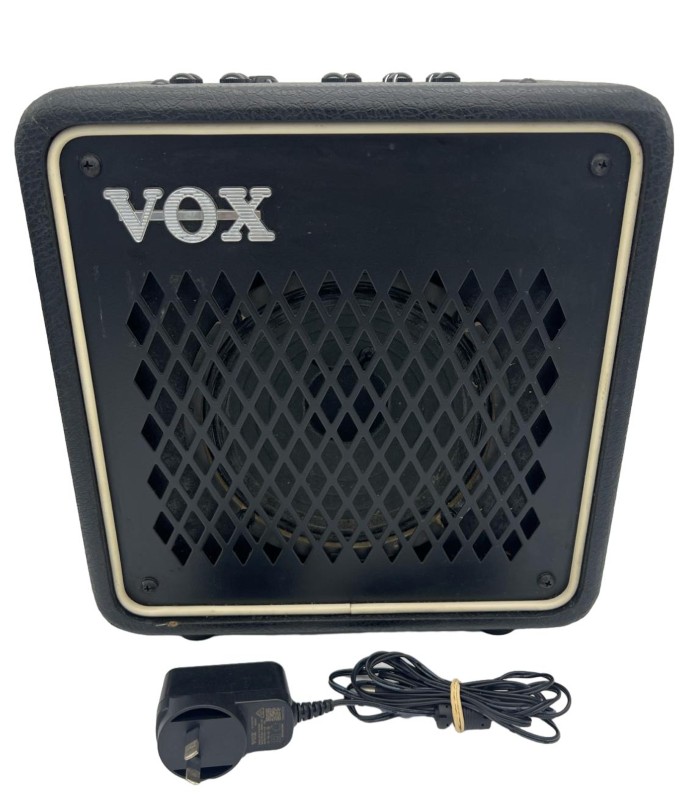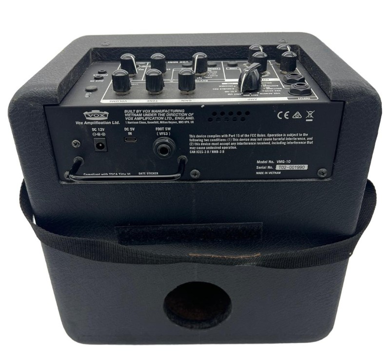 This compact Vox VMG-10 guitar amplifier offers a versatile and reliable performance. With a power cable included, it provides the essential connectivity needed for your musical setup. The amp showcases a sleek design and is in good condition, displaying only minor signs of wear from previous use.
