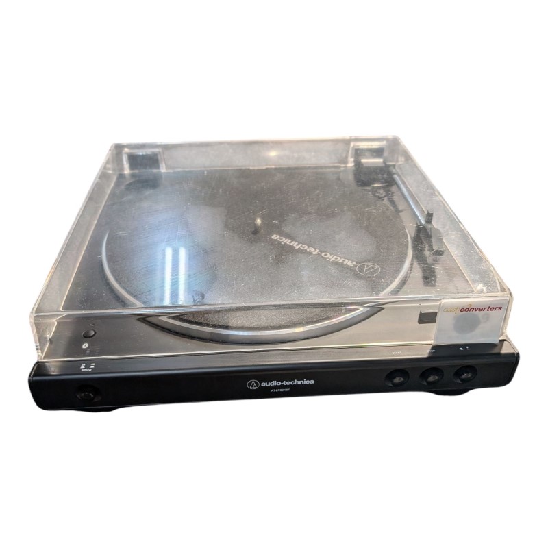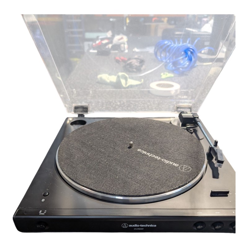This AUDIO-TECHNICA AT-LP60XBT AUTOMATIC WIRELESS TURNTABLE is a versatile and convenient DJ equipment piece. Featuring Bluetooth connectivity, it allows for wireless streaming of your music collection. With its automatic operation, it provides effortless playback at the touch of a button. Despite a small chip on the plastic casing, this turntable remains in good working condition and ready to elevate your listening experience.