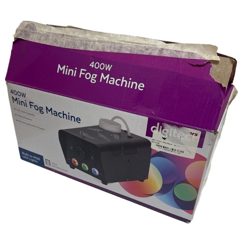 This compact Digitech AF-1225 Mini Fog Machine is a versatile piece of DJ equipment that can add an atmospheric touch to your performances. With the included power supply and remote, you can easily control the fog output to create the perfect ambiance. Although it shows light cosmetic wear, the machine remains fully functional and ready to enhance your musical events.