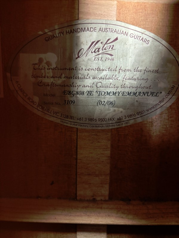 This MATON EBG808 TE TOMMY EMMANUEL (02/06) acoustic guitar is a well-crafted instrument with a rich, resonant tone. Featuring a solid tonewoods construction, it delivers exceptional projection and clarity. The guitar functions well and exhibits light cosmetic wear, giving it a pleasing vintage aesthetic.
