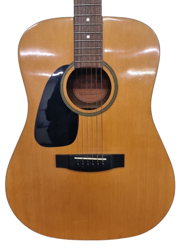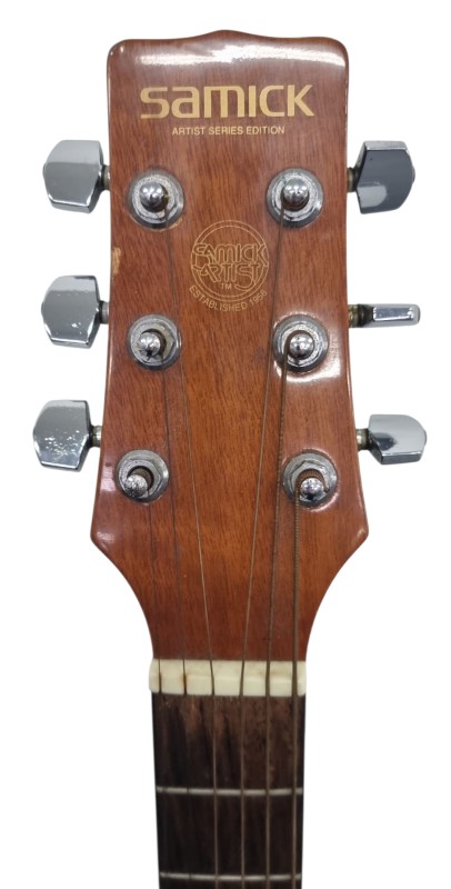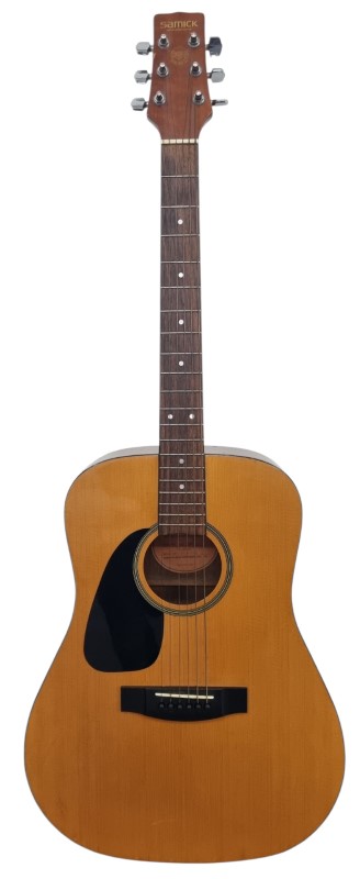 This Samick Artist Series Edition Dreadnought acoustic guitar offers a classic sound and design. With its solid spruce top and mahogany back and sides, it delivers a warm, resonant tone perfect for a variety of musical styles. The comfortable neck and easy-to-play fretboard make this guitar a pleasure to perform on, whether you're a beginner or an experienced player.