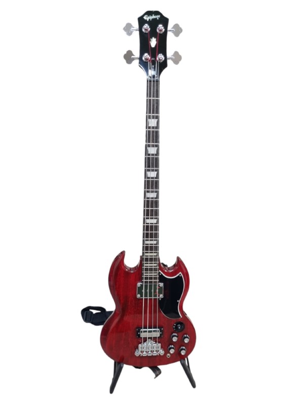 This Epiphone SG Bass EB3 2-Pickup Electric Bass Guitar in Cherry is a versatile and reliable instrument. With its iconic SG-style body and dual pickups, it delivers a rich, powerful tone perfect for a variety of musical styles. The included hard case and plush strap provide convenient storage and transport. This bass guitar is in good condition with little sign of wear, making it an excellent choice for both seasoned players and those new to the instrument.
