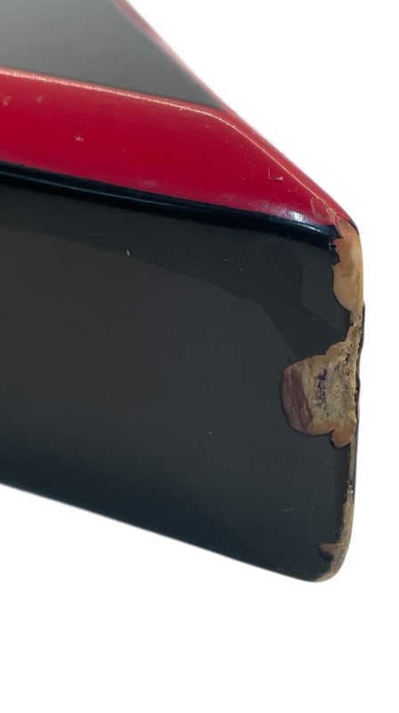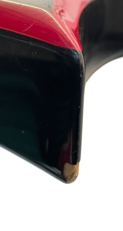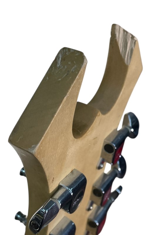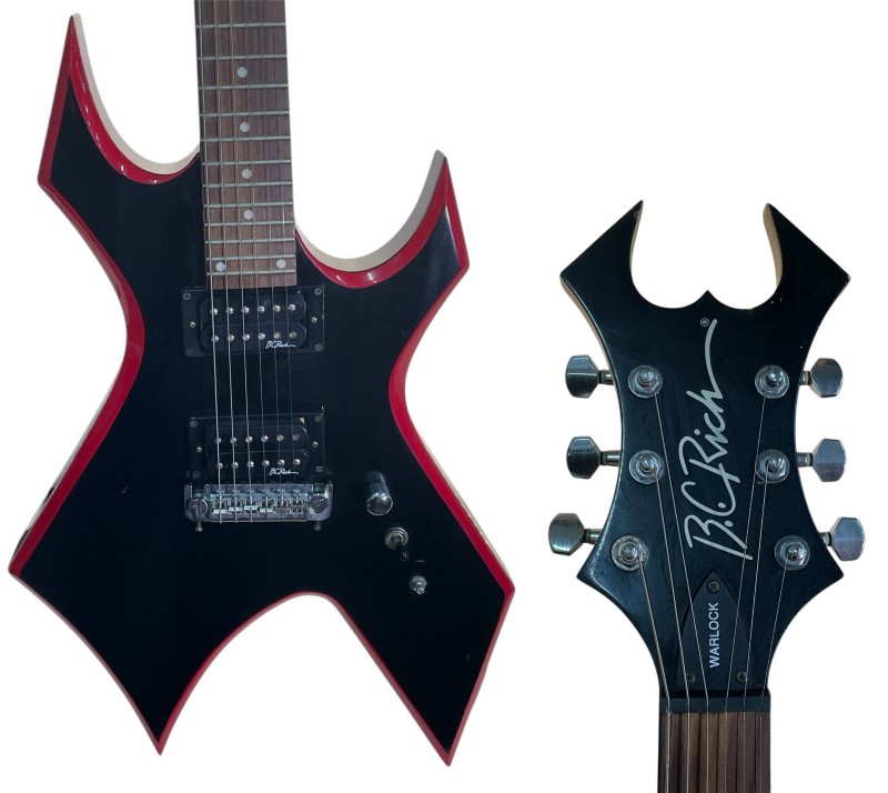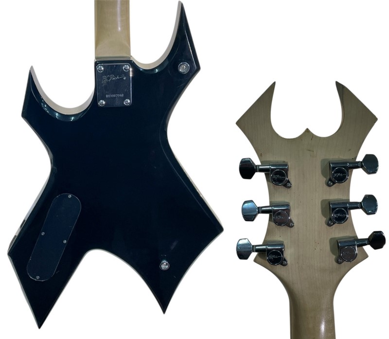 This well-known B.C. Rich Warlock electric guitar has seen its fair share of use over the years, but it remains a functional and iconic instrument. Despite the heavy wear, scratches, dents, and paint chips, as well as damage to the headstock, this guitar still delivers the signature B.C. Rich tone and playability. While it may not be in pristine condition, this Warlock is a great choice for musicians seeking a unique and characterful guitar with plenty of rock 'n' roll attitude.