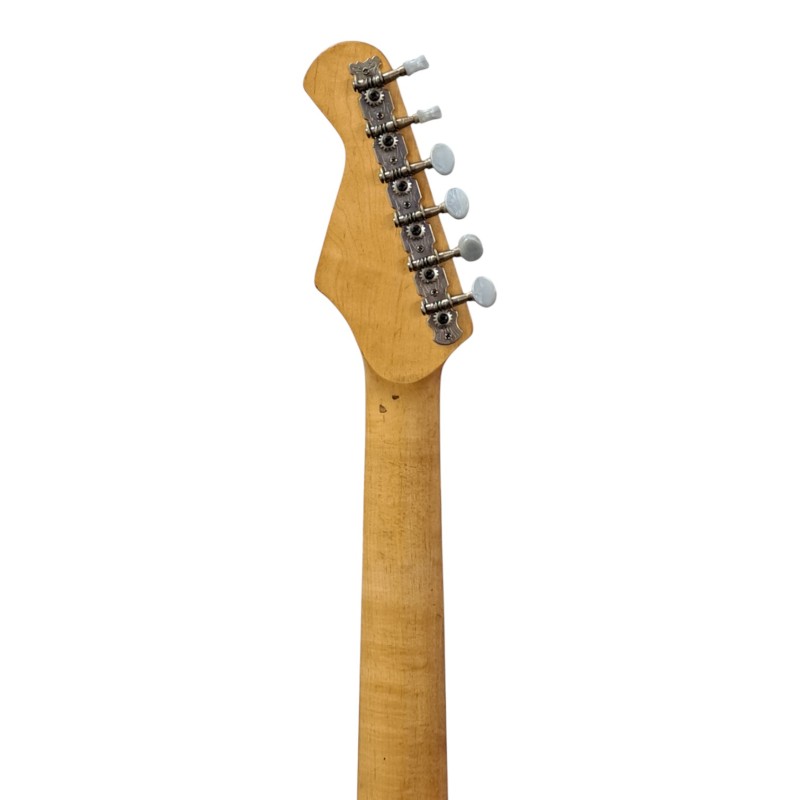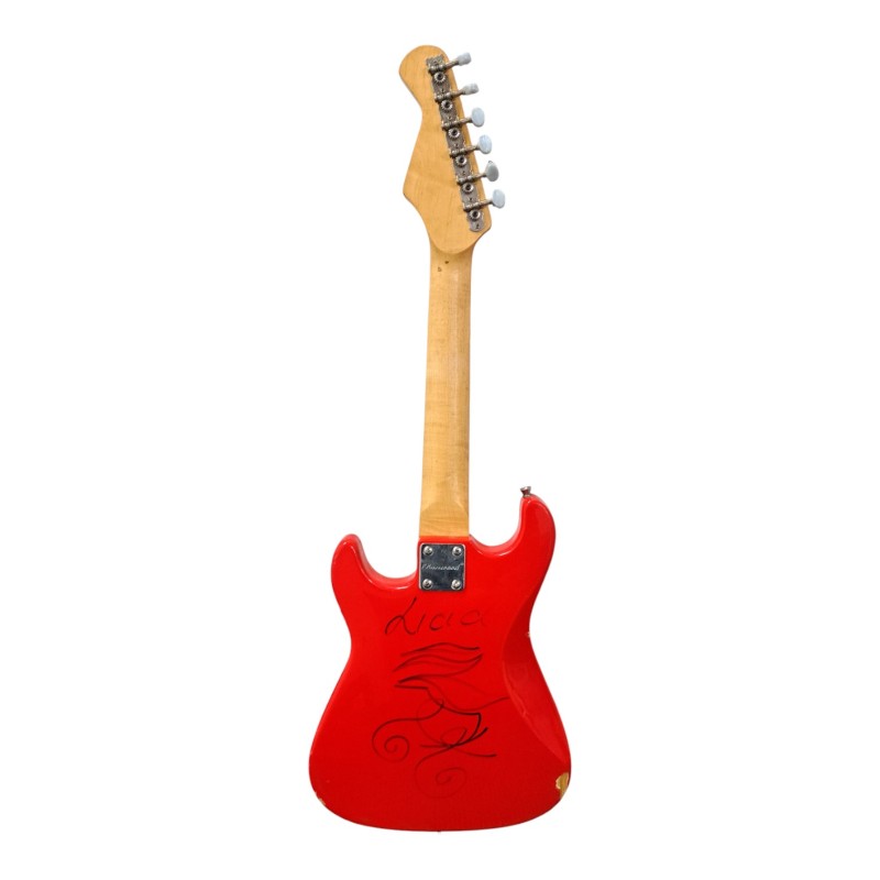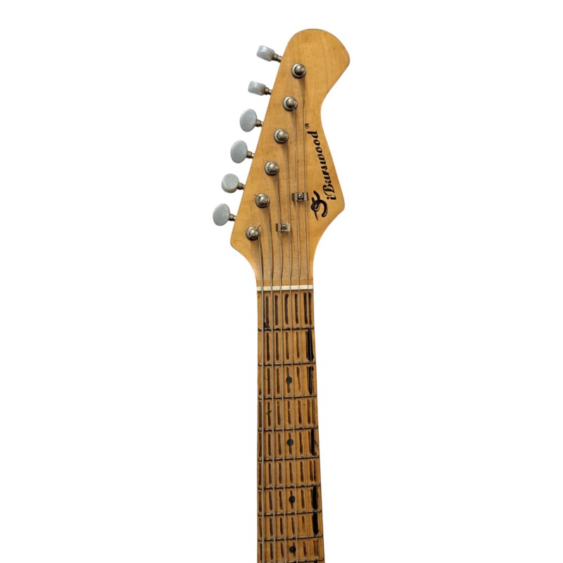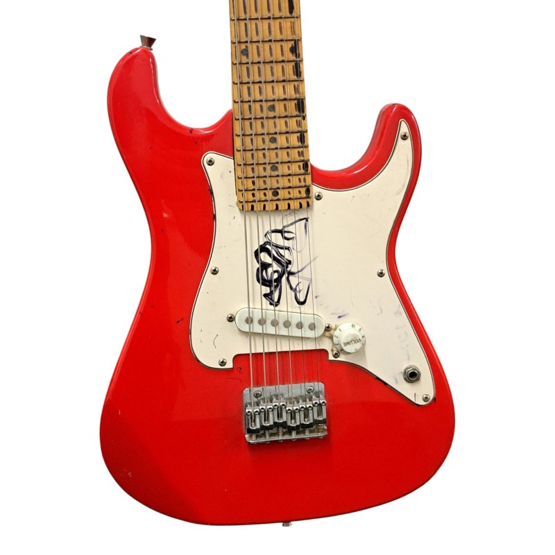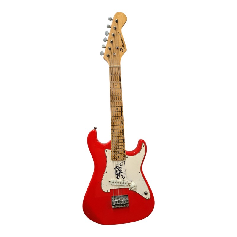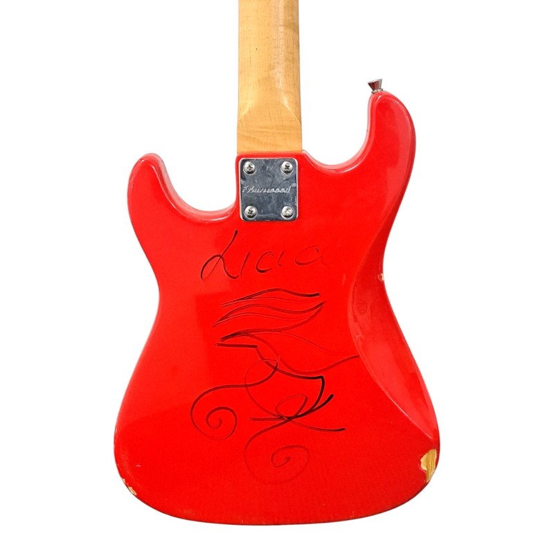 This compact and portable burswood electric mini guitar in a vibrant red finish is a great option for beginner musicians or those seeking a travel-friendly instrument. Despite its diminutive size, it delivers a surprisingly full and rich sound, making it a practical choice for practice sessions or casual performances. While it may show signs of heavy use, this guitar remains fully functional and ready to provide hours of musical enjoyment.