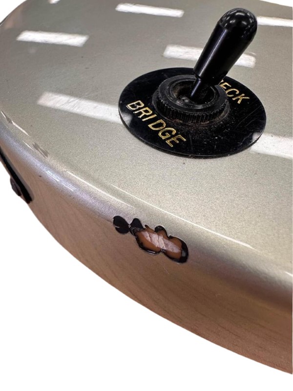 The guitar shows usage with a couple dings on the body with light scratching to it. The fretboard has no sharp frets making playability smooth and the electronics work normally.