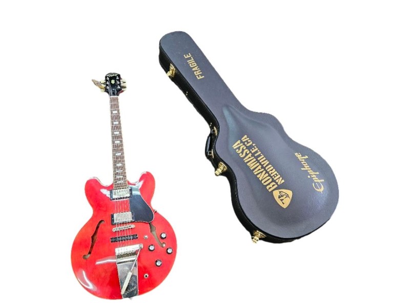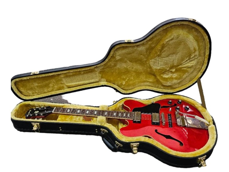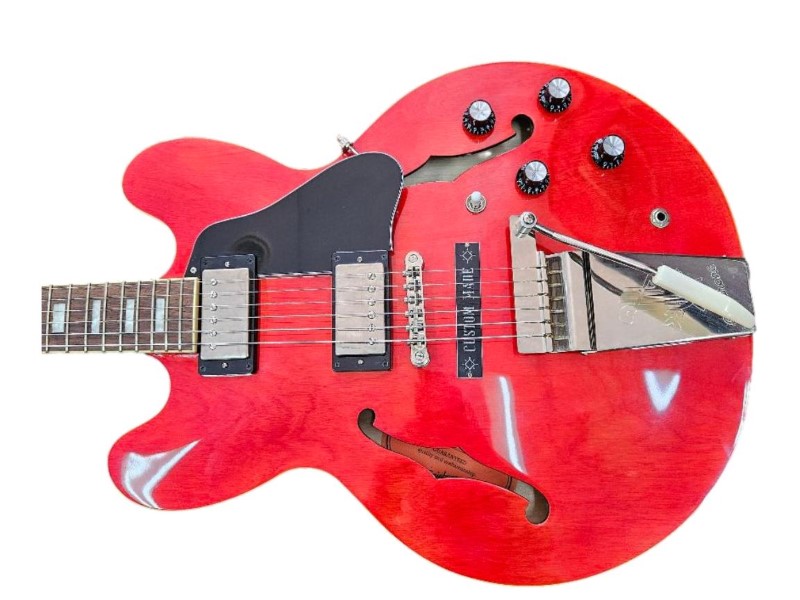 This Epiphone ES-335 electric guitar offers a classic semi-hollow body design with a warm, rich tone. Its maple top, back, and sides provide a balanced and resonant sound, while the dual humbucking pickups deliver versatile tonal options. The guitar's smooth playability and comfortable neck make it a pleasure to perform on.