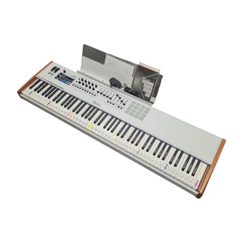 This Arturia KEYLAB 88 MIDI controller is a versatile and reliable instrument for music production and performance. With its 88-key semi-weighted keyboard, it provides a natural and responsive feel for playing virtual instruments and controlling your digital audio workstation. The included power, stand, and manual accessories ensure you have everything you need to get started. While the item does not come with a carrying case, it remains in good condition with only minor signs of wear.