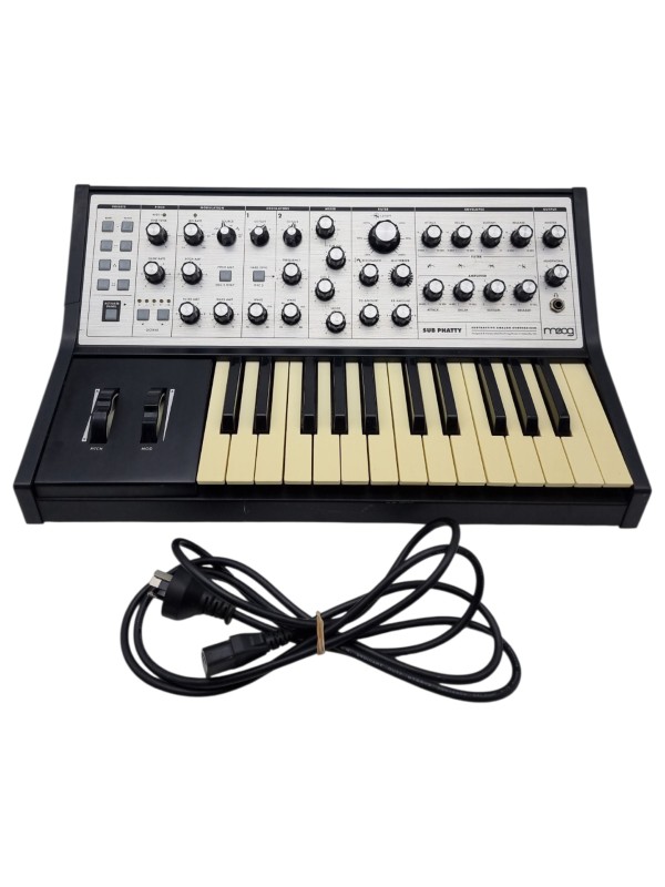 This Moog Sub Phatty Analog synthesiser offers a powerful and versatile sound, perfect for a range of musical styles. With its classic analog circuitry, it delivers a rich, warm tone that can be sculpted through its intuitive controls. Despite some light cosmetic wear, the synthesiser remains in good working condition and ready to elevate your musical creations.
