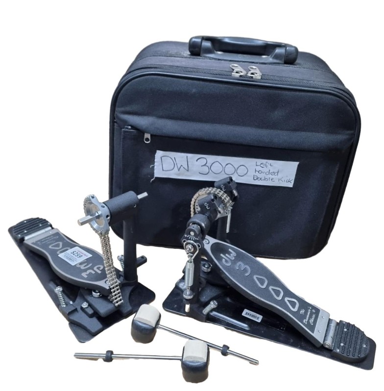 This DRUMMER'S CHOICE DW3000 LEFTY DOUBLE KICK drum pedal is a versatile and durable percussion accessory designed for left-handed drummers. The pedal features a sturdy construction and smooth action, allowing for precise and responsive performance. With the included carrying case, you can easily transport the pedal to your gigs or practice sessions. This item is in good condition, with only minor signs of wear.