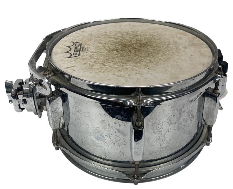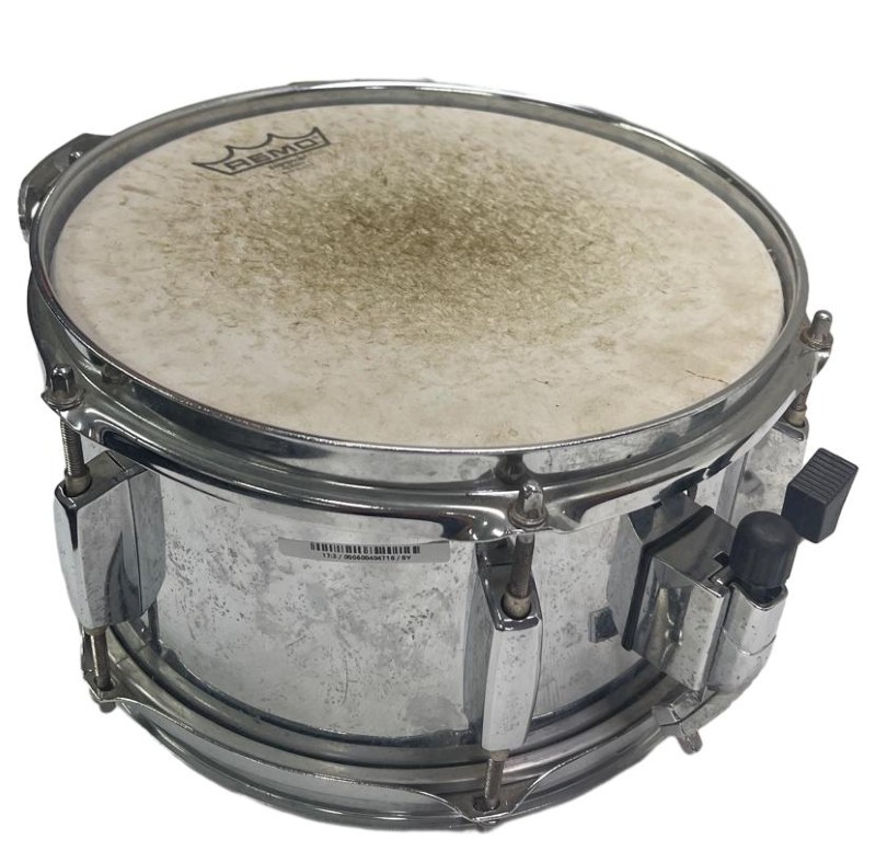 This snare drum is a functional percussion instrument ready for practice or performance use. Despite showing signs of heavy wear consistent with its age and previous use, it remains in working condition and capable of producing sound.