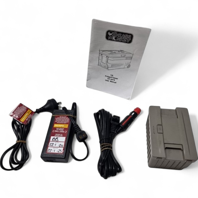 This versatile 74L Brass Monkey portable fridge/freezer is perfect for your next camping trip or outdoor adventure. With a 12/24V voltage, it can be powered from your vehicle or with the included solar charger input. The removable battery option and convenient handles and wheels make it easy to transport. This unit is in good condition with little sign of wear, ready to keep your food and drinks chilled.