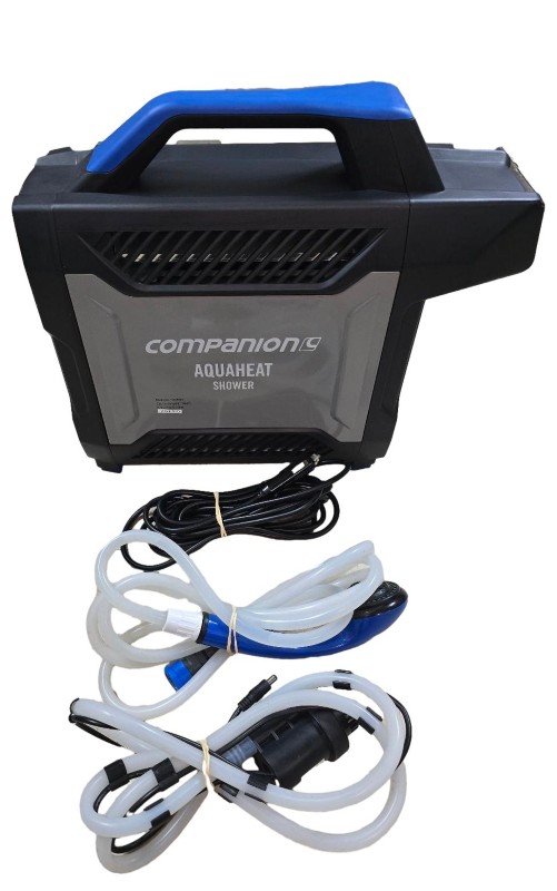 This portable camp shower from COMPANION provides a convenient way to stay refreshed while on the go. The AQUAHEAT model features a hose and cigarette power cord, allowing you to enjoy a warm water rinse wherever your adventures take you. With little sign of wear, this shower is in good condition and ready for your next camping trip or outdoor excursion.